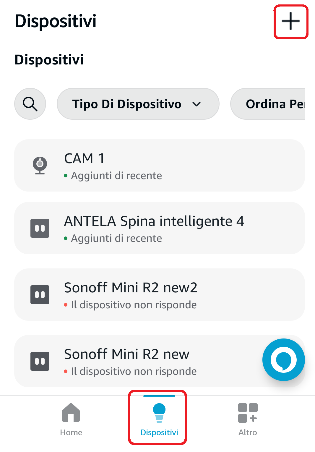 - Aprite la app Alexa, cliccate in basso su Dispositivi e poi in alto su +;