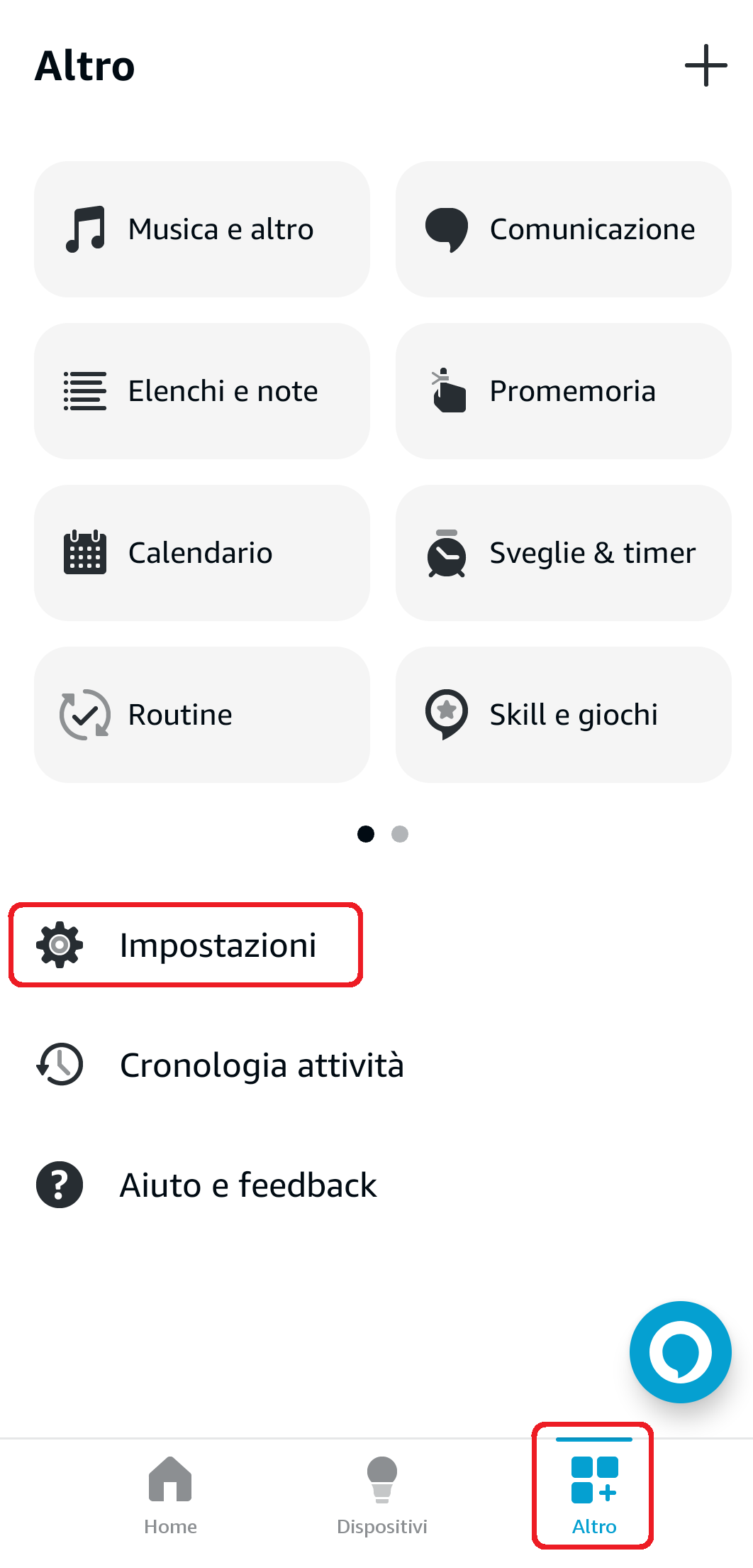 - Aprite la app Alexa, cliccate su Altro nella barra menu in basso e poi su Impostazioni;