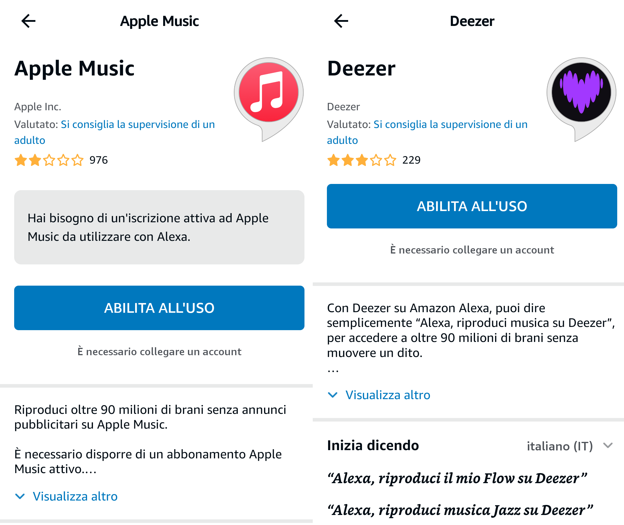 - Quasi tutti i servizi ad eccezione di Amazon Music richiedono l’abilitazione della relativa skill e l’abbinamento dell’account del servizio (es.: Spotify) a quello di Amazon;