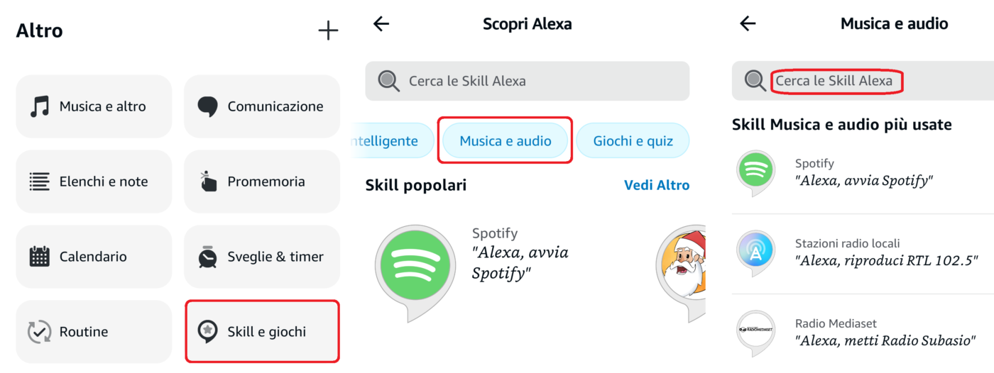 - Se non avete ancora installato una skill audio potete farlo ora cliccando sempre sull’icona Altro (in basso), poi su Skill e Giochi ed infine su Musica e audio (in alto). Potete anche effettuare una ricerca libera per parola chiave (es.: Radio Montecarlo) cliccando in alto su Cerca le Skill Alexa;