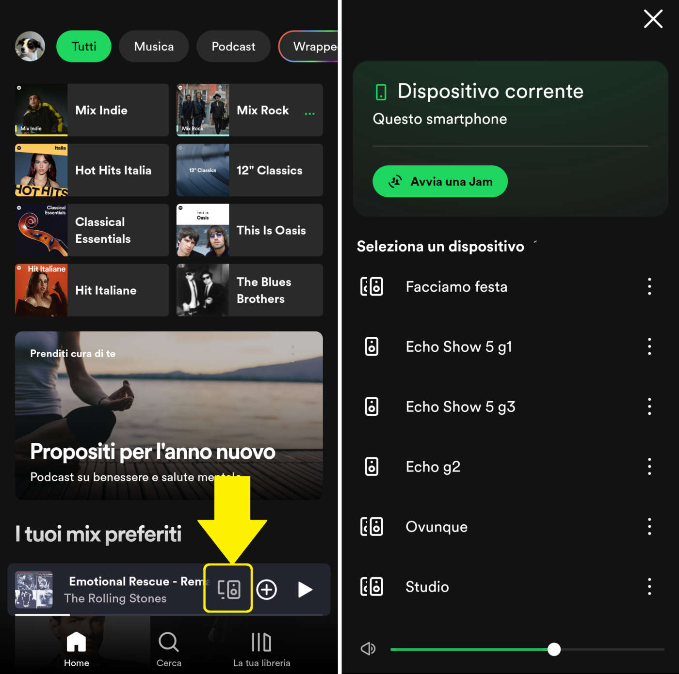 Quando utilizzate una app specifica come Spotify (invece di Alexa) per ascoltare la vostra musica preferita troverete nella barra di riproduzione l’icona altoparlante (vedi foto sotto) per selezionare gli altoparlanti Bluetooth/Alexa, le stanze e i gruppi verso i quali indirizzare i contenuti audio.