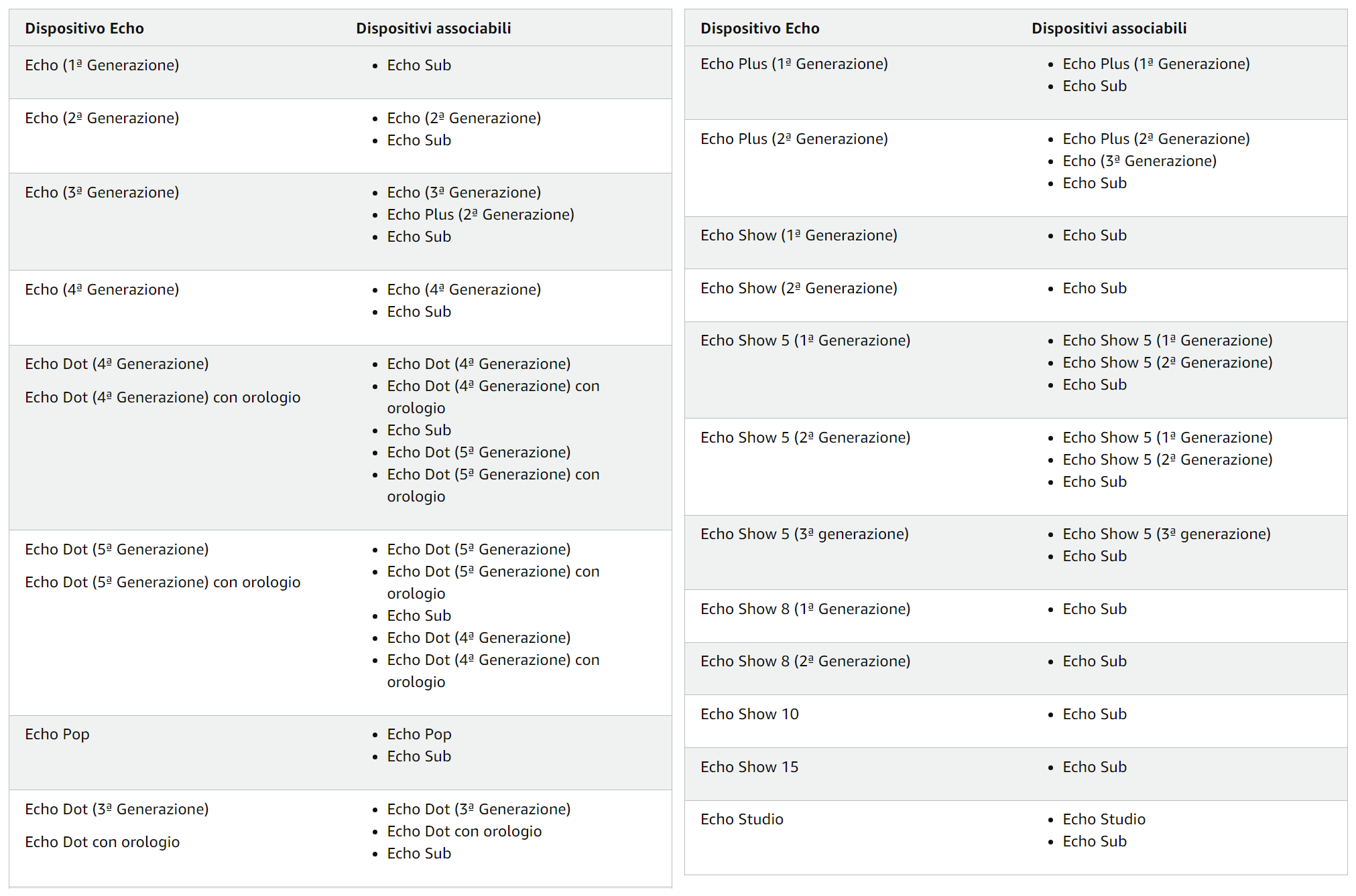 Se possedete almeno due smart speaker/display Echo compatibili tra loro (vedi tabella sotto), installati nella stessa stanza e collegati alla stessa rete Wi-Fi, potete però abbinarli tra loro in modo da indirizzare su ogni singolo altoparlante le tracce audio destra/sinistra e ottenere così un suono stereofonico.