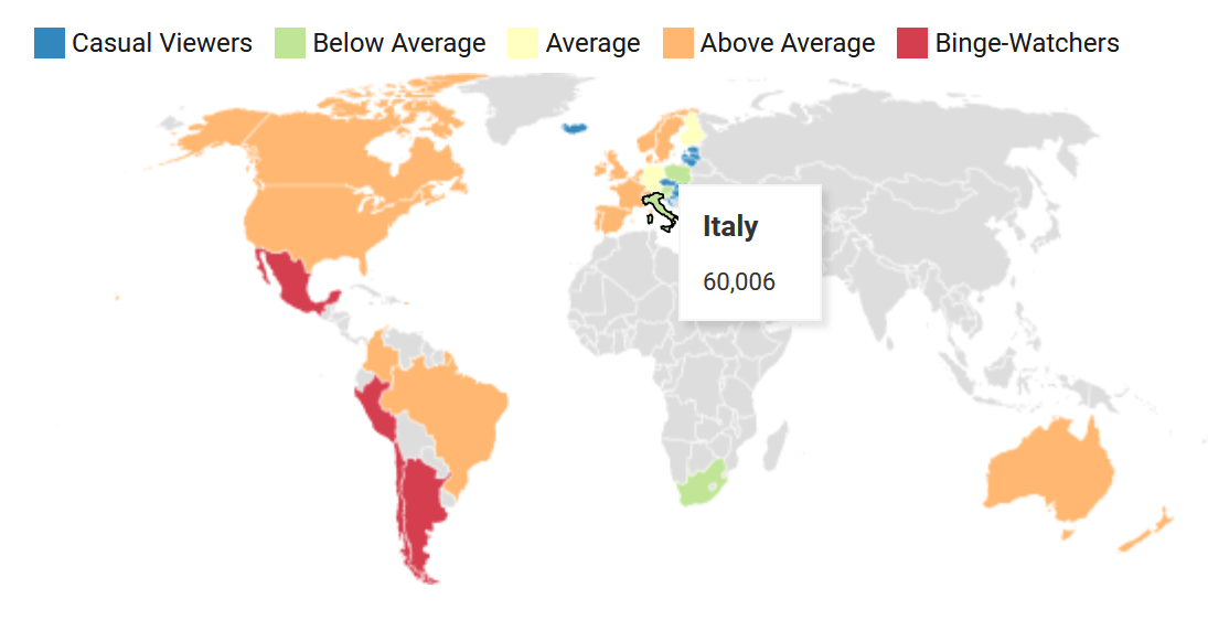 Netflix ha analizzato la sua cronologia di visualizzazione relativamente a 45 nazioni: l’utente medio italiano ha guardato la piattaforma per l’equivalente di 42 giorni, mentre la media mondiale è di 47 giorni. Ecco tutti i dati.