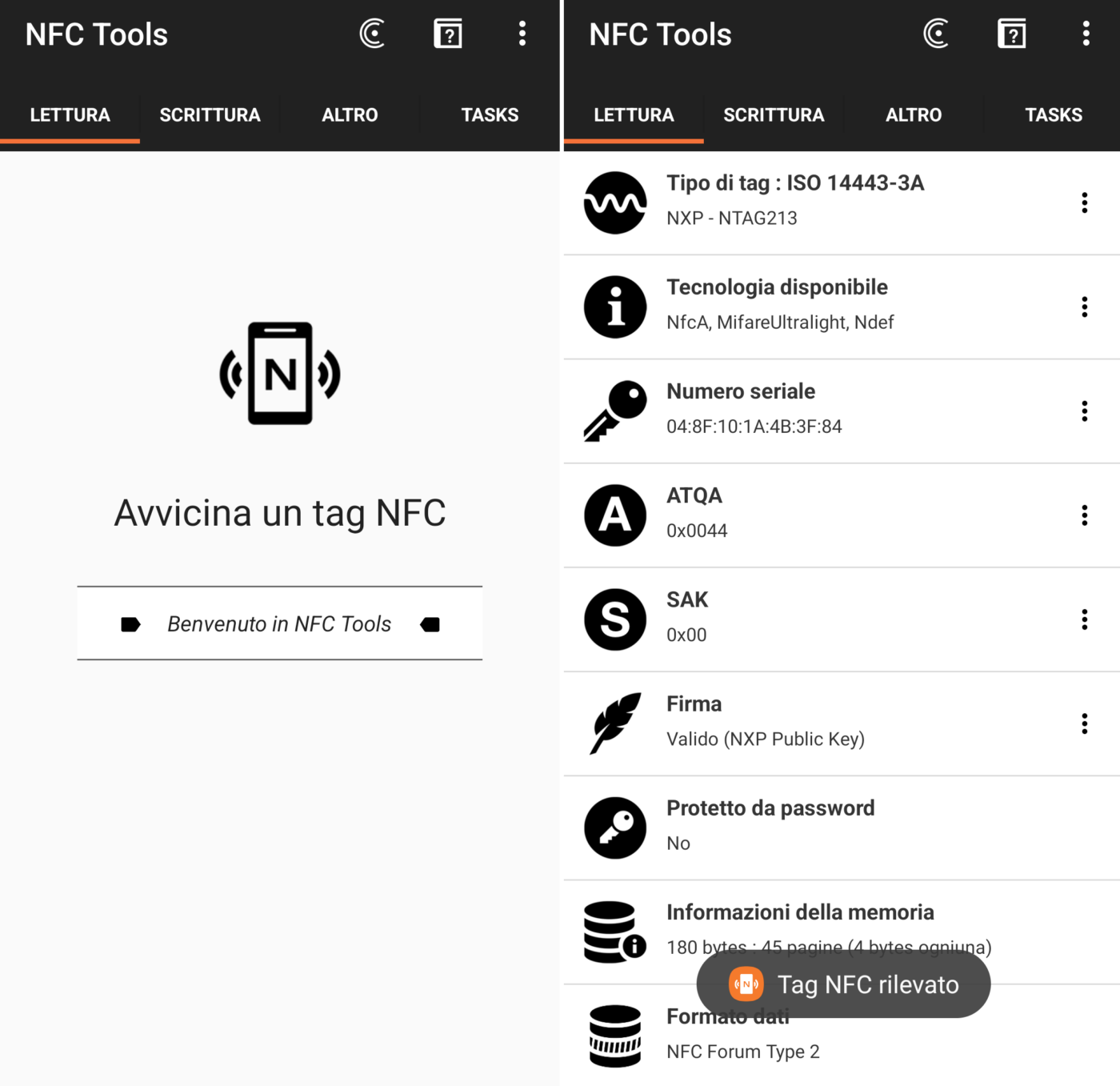 A questo punto basterà avvicinare il tag ad un altro smartphone per trasferire automaticamente in rubrica i dati di contatto in formato vCard (o altri), accedere direttamente a un sito web, ecc.