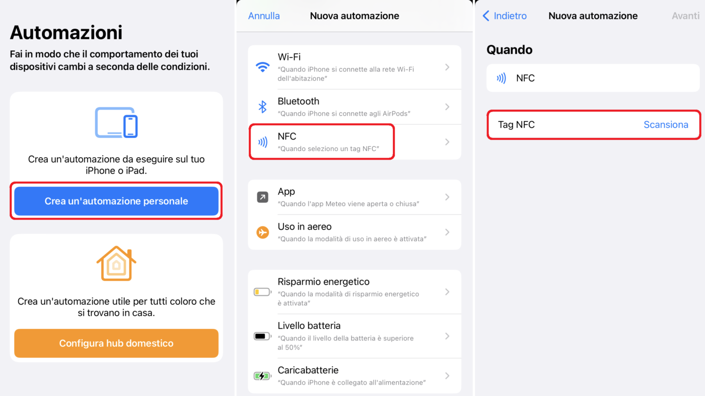 Se possedete un iPhone potete accedere direttamente alla app Comandi Rapidi, cliccare in basso su Automazioni, creare un’automazione personale e selezionare in basso la voce NFC da utilizzare come “trigger” (evento scatenante).