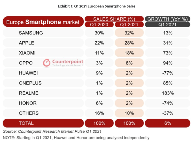 Secondo una ricerca di mercato condotta da Counterpoint Research, Oppo ha raggiunto una crescita del 94% anno su anno in Europa durante il primo trimestre del 2021. Raddoppiando la sua quota di vendite in un anno, l’azienda si colloca come il quarto più grande produttore di smartphone in Europa.