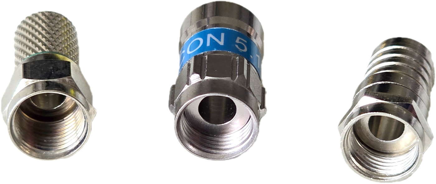 I connettori F a compressione sono professionali e affidabili quanto quelli a crimpare (tenuta stagna, conducibilità elettrica ottimale, elevata resistenza, ecc.) ma richiedono sempre una pinza dedicata e lo spelacavo coassiale. La procedura di intestazione è spiegata qui.
