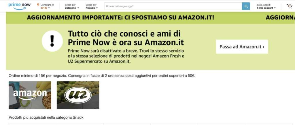 Conseguentemente la app di Prime Now cessa di esistere per diventare parte di quella di Amazon e analogamente accadrà al sito web, che al momento risulta ancora raggiungibile.