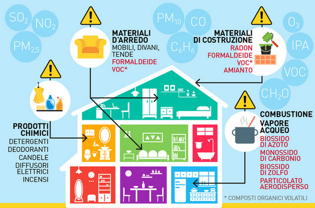 Senza contare poi i COV (Composti Organici Volatili) rilasciati da sigarette, incensi, candele, vaporizzatori, materiali di costruzione ed arredamento, vernici, solventi, prodotti per la pulizia e la cura della persona, stampanti e fotocopiatrici (polvere di toner), ecc.