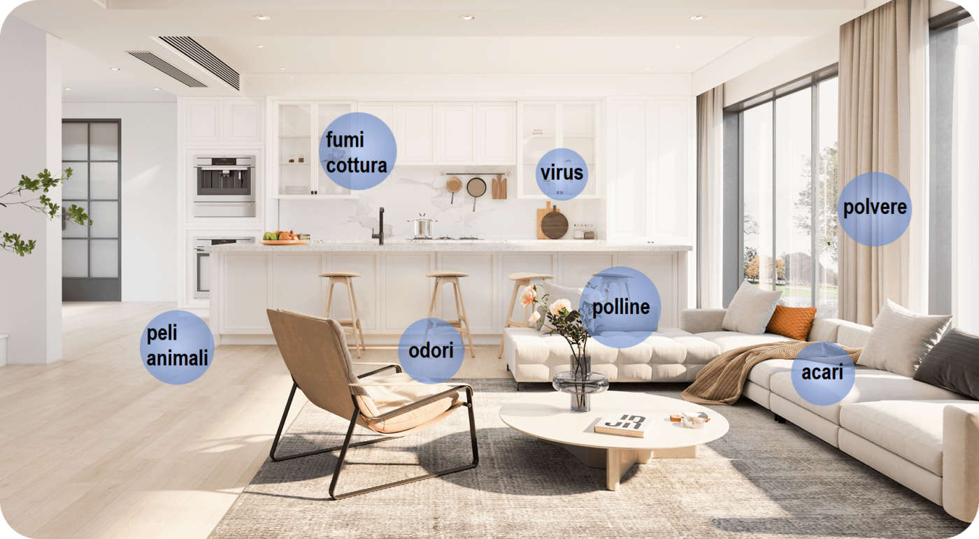 Lo scopo è di migliorare la qualità dell’aria respirata e il comfort di tutta la famiglia, in particolare dei soggetti più deboli e a rischio (anziani con patologie respiratorie, asmatici, allergici, ecc.) e in presenza di animali domestici.