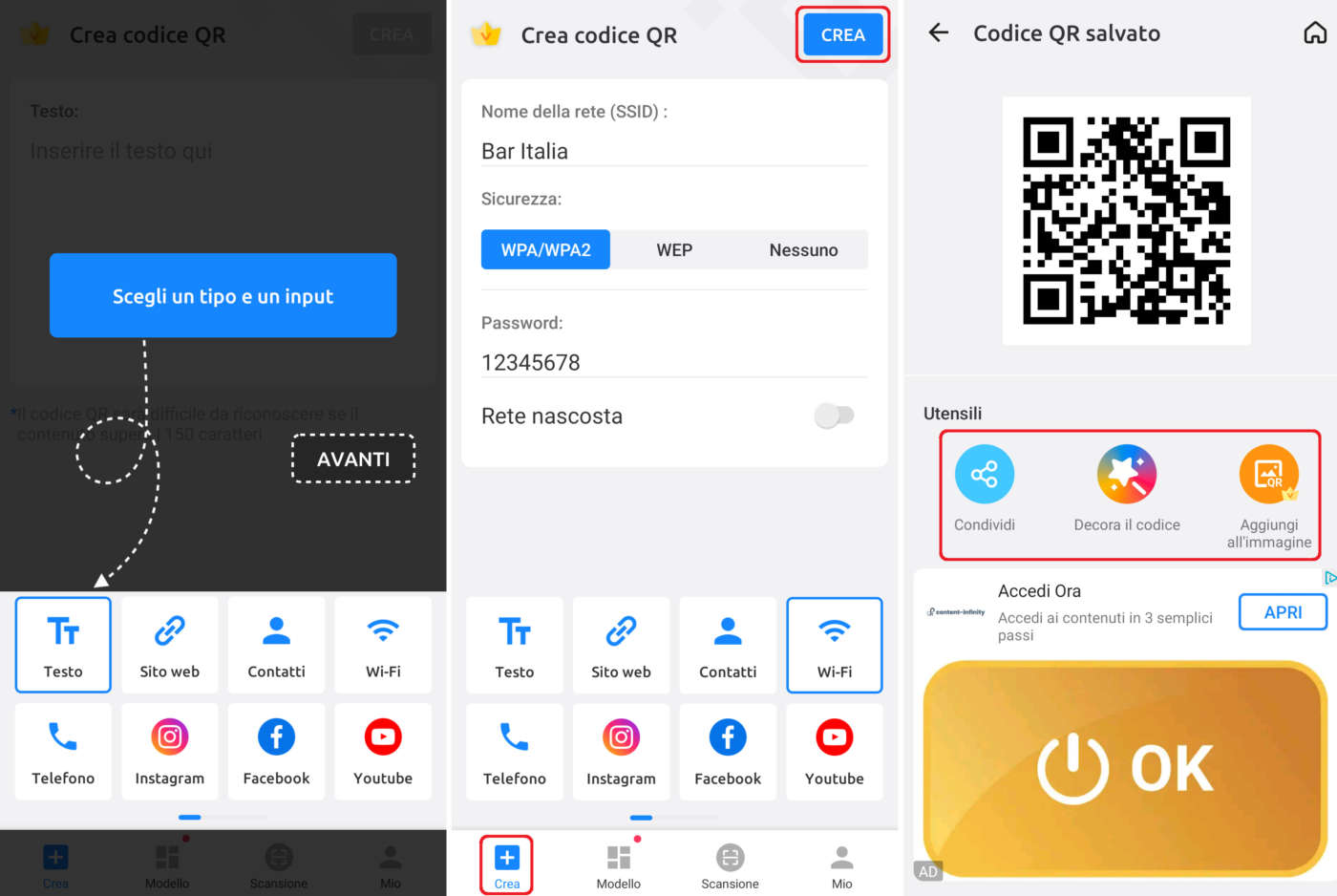 Le funzioni base sono sempre gratuite mentre quelle “extra” (come l’aggiunta di loghi, immagini, colori, ecc.) richiedono spesso la registrazione gratuita, un pagamento una-tantum oppure un abbonamento (sempre in-app).