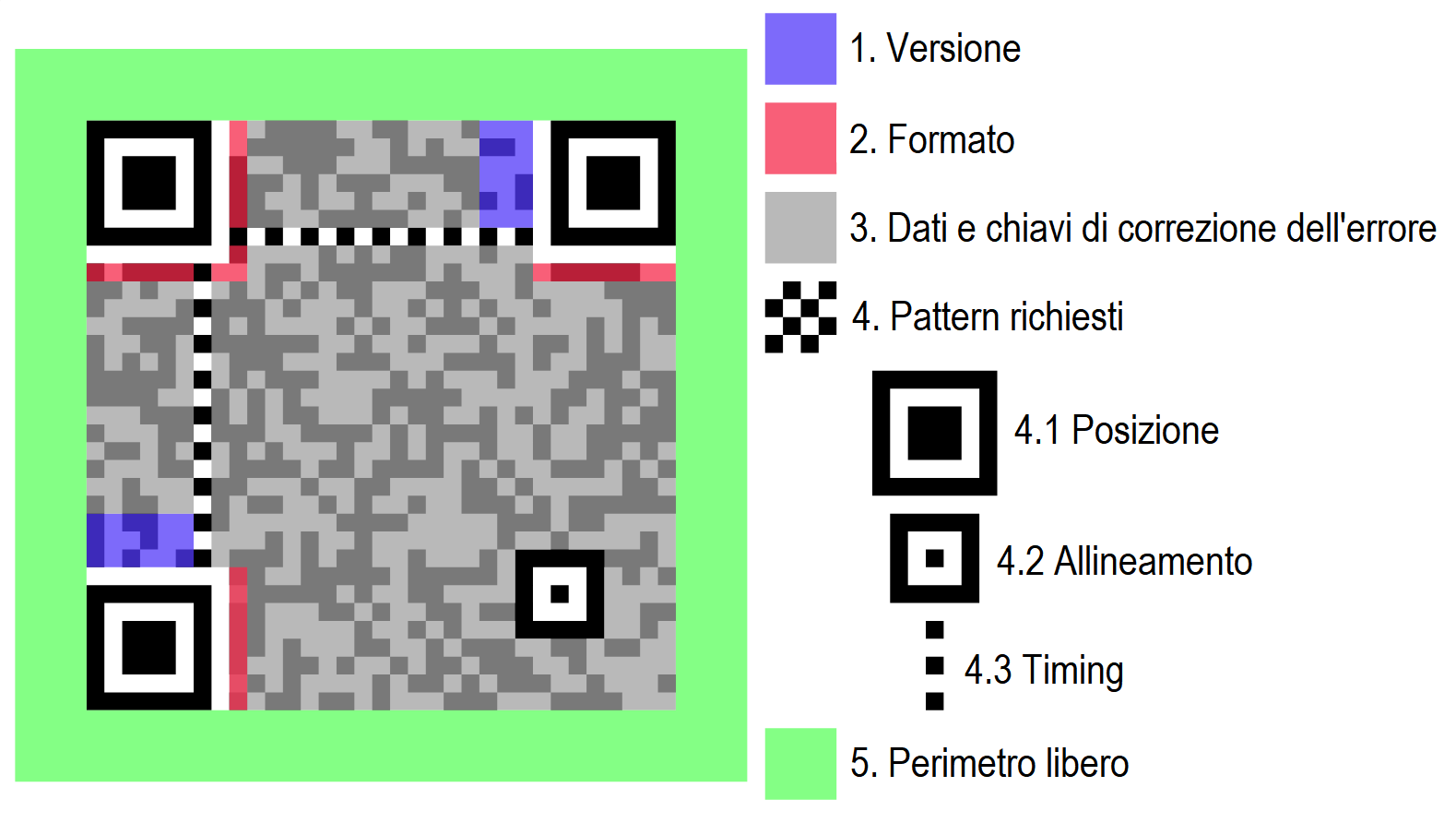 Oltre ai dati e alle chiavi di correzione degli errori, il QR Code include le informazioni di versione e formato, i pattern di posizione, allineamento e timing per una corretta e rapida decodifica della “scacchiera”.