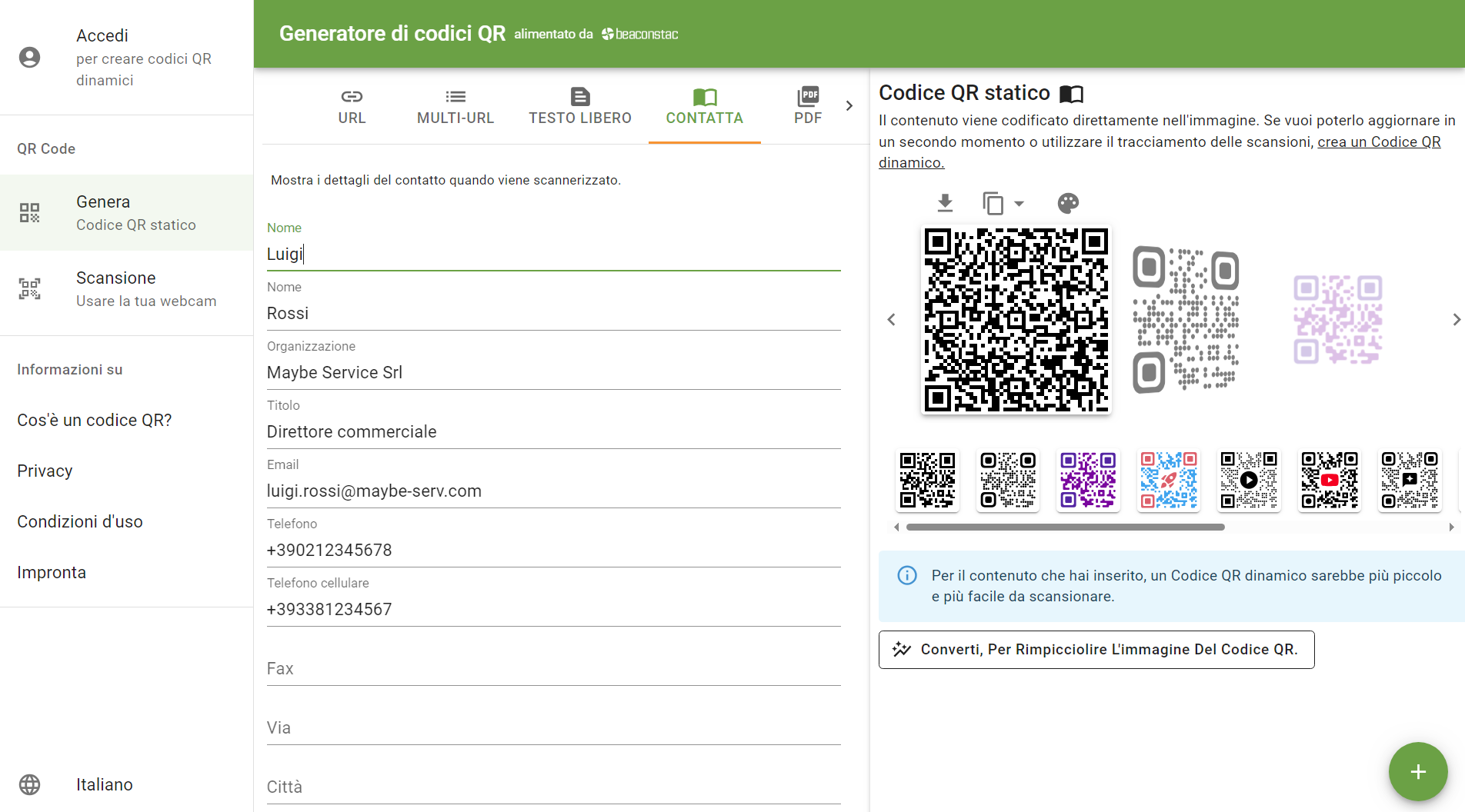 Come già anticipato, un QR Code può contenere qualsiasi tipo di dato numerico e/o alfanumerico come ad esempio un codice di accesso o di registrazione (ad esempio per il setup iniziale dei dispositivi domotici – smart switch, telecamere IP, ecc.), uno o più numeri telefonici, il collegamento ad un sito web (URL), uno o più indirizzi di posta elettronica, testi brevi oppure un mix di tutto questo, ad esempio per la creazione e l’acquisizione rapida dei biglietti da visita digitali (vCard).