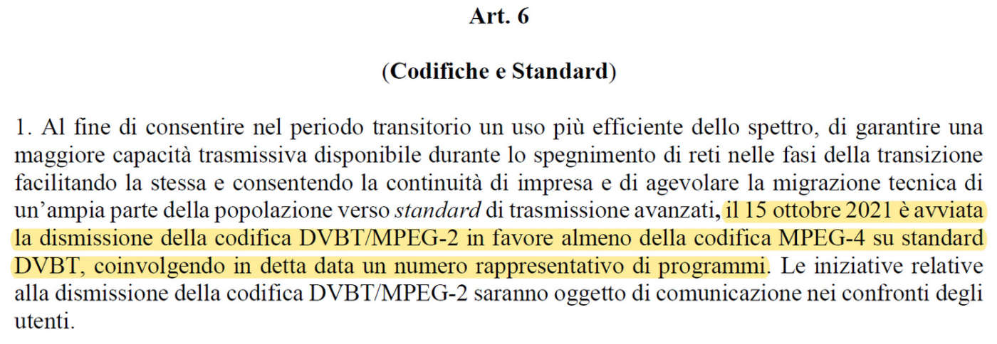 Il decreto parla di “dismissione della codifica DVB-T/MPEG-2 in favore almeno della codifica MPEG-4 su standard DVB-T”, lasciando quindi intendere la possibilità di passare anche all’HEVC ma ancora su DVB-T visto che l’ultima fase dello switch-off (DVB-T2+HEVC Main 10) è stata rinviata ufficialmente al 2023.