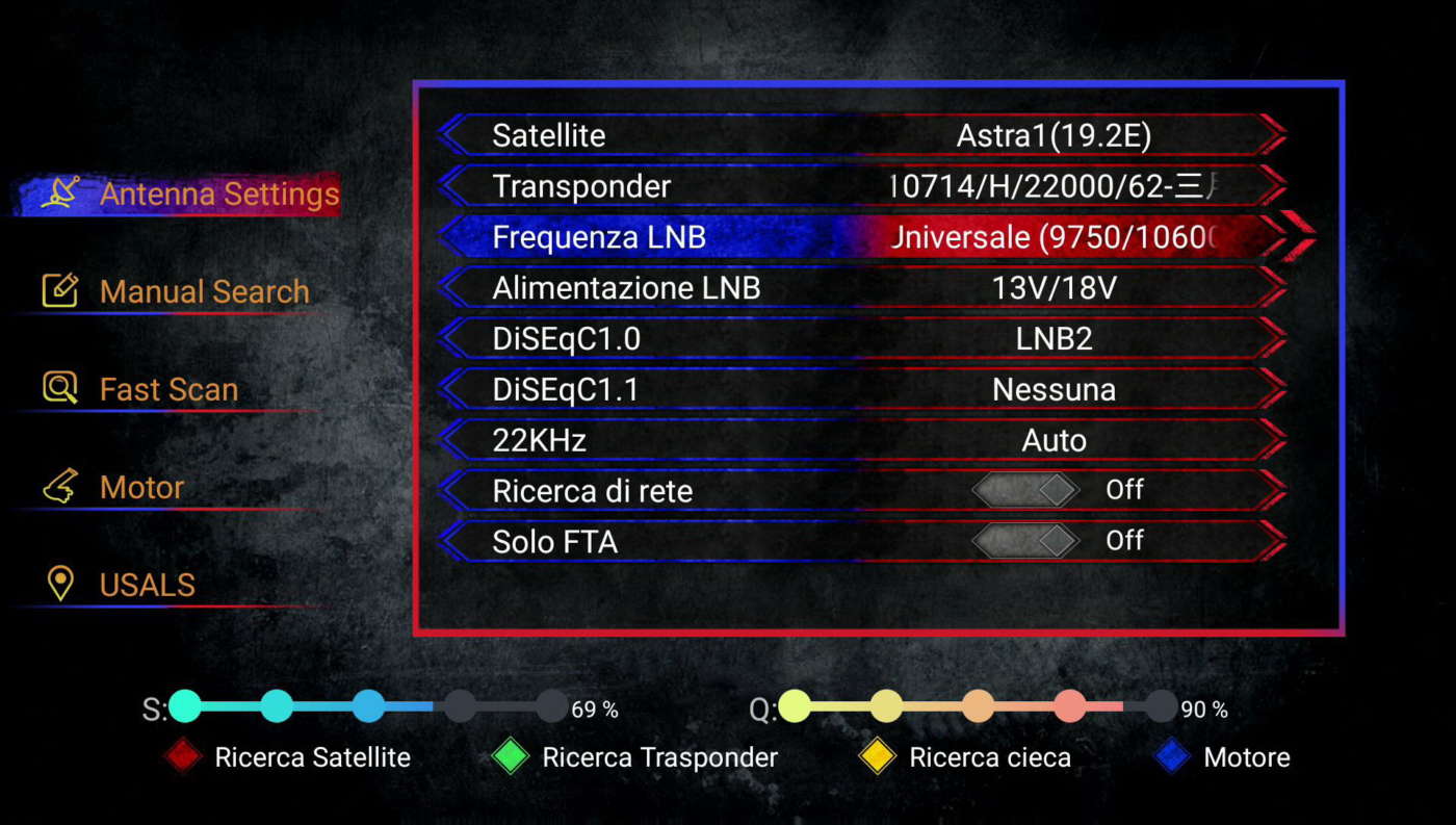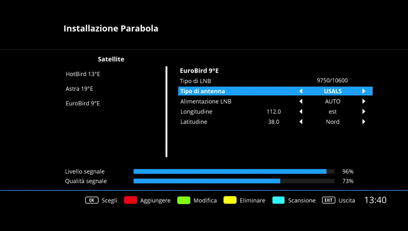 Per quanto riguarda invece il motore monocavo DiSEqC 1.2, è sufficiente abilitare le voci “Motore DiSEqC” e/o “USALS” e configurarlo come indicato nel manuale d’uso e installazione (tipologia, limiti posizione est/ovest, ecc.).