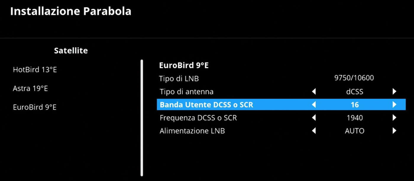 Da alcuni anni vengono montati anche LNB di tipo SCR e dCSS che richiedono una corretta configurazione all’interno del menu del decoder/Tv, sia per quanto riguarda la tipologia (opzioni “SCR”, “SCD” o “Unicable” per SCR e “dCSS”, “SCD2”, “Jess” per dCSS) sia per la scelta della banda utente da impostare per ogni singolo decoder/Tv collegato alla parabola (es.: primo Tv/decoder con frequenza UB – User Band – di 1210 MHz, secondo Tv/decoder a 1420 MHz, terzo Tv/decoder a 1550 MHz, ecc.). Per ulteriori informazioni sulle tecnologie SCR e dCSS vi rimandiamo a questo articolo di approfondimento.
