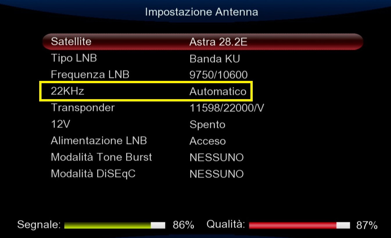 Anche il tono da 22 kHz si può attivare automaticamente in base alle frequenze del database oppure manualmente, sempre dal menu OSD del decoder/Tv.