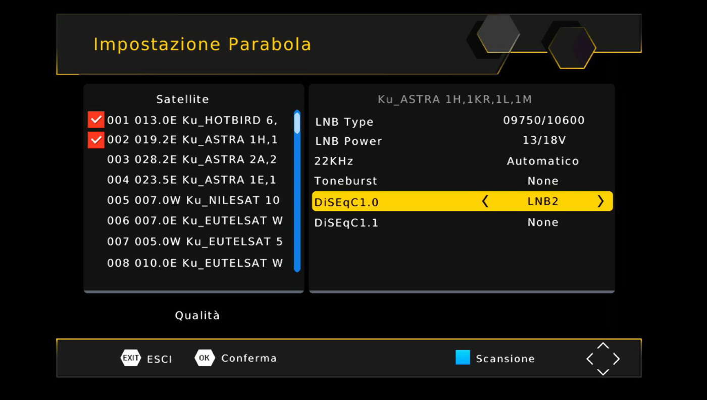 Di norma la posizione DiSEqC 1 oppure A è associata a Hotbird 13° Est mentre Astra 19,2° Est occupa la posizione DiSEqC 2 oppure B.