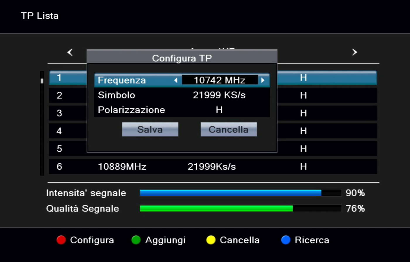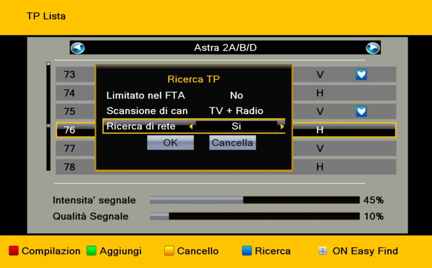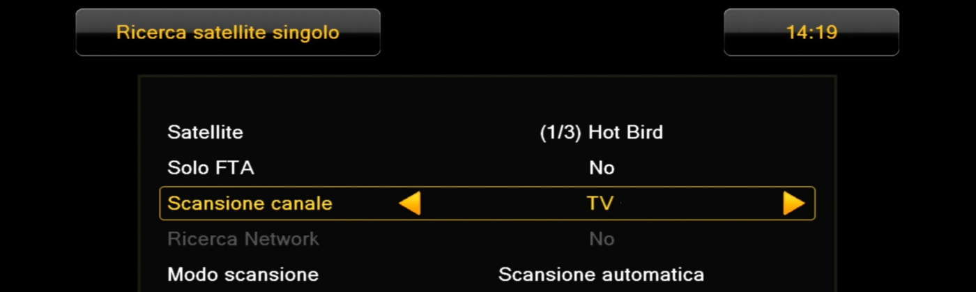 Prima di effettuare la ricerca, consigliamo di verificare se le impostazioni (tipo di LNB, frequenza O.L., posizioni DiSEqC, ecc. – vedi FAQ sotto) corrispondono ai componenti montati sulla parabola (LNB, motore, commutatore DiSEqC, ecc.) e al suo puntamento (verso uno o più satelliti – es.: Hotbird 13° Est, Astra 19,2° Est, ecc.).