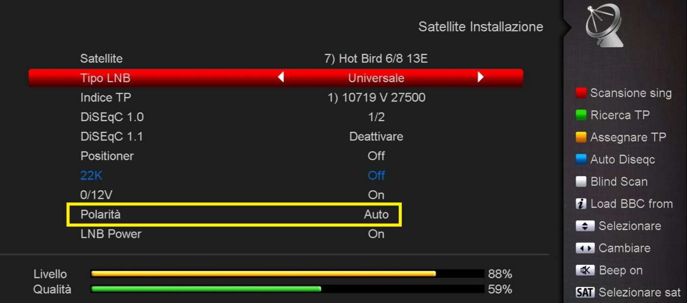 Quasi tutti i decoder e i Tv con sintonizzatore satellitare DVB-S/S2 possono impostare la polarità in maniera automatica (opzione “Auto”, “13V/18V” o “13V/17V” nella voce “Polarità” del menu Antenna) oppure manuale (opzioni “13V”, “17V”, “18V”, ecc.).