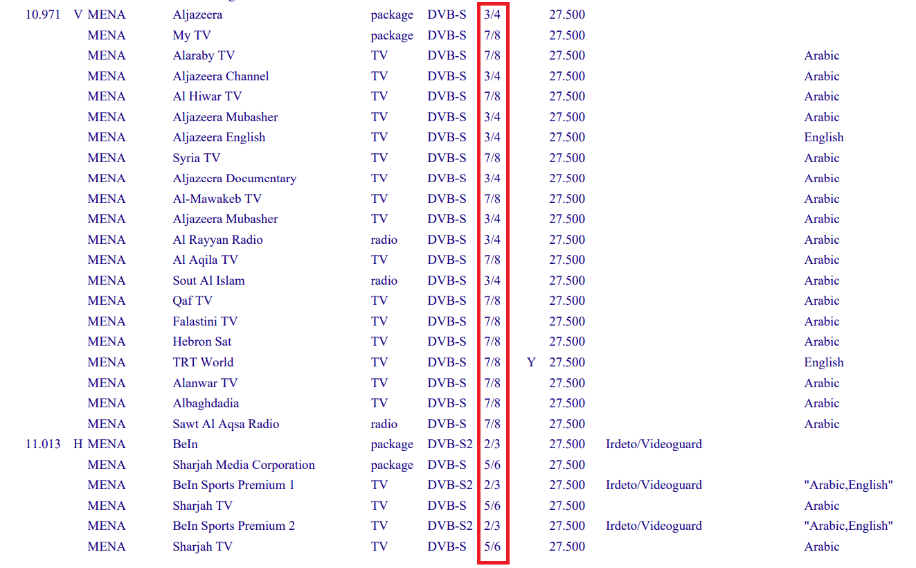 Quando il FEC è pari a 3/4 significa che vengono usati 3 bit di informazione su 4 totali con 1 bit di controllo. Se il FEC è 2/3 i bit totali sono 3 di cui 2 di informazione e 1 di controllo mentre con 5/6 i bit totali sono 6 di cui 5 di informazione e sempre 1 solo di controllo. Un transponder che trasmette con FEC 2/3 è migliore di uno che usa il FEC 3/4 o 5/6 perché il bit di controllo è sempre uno mentre quelli di informazione 3 o 5.