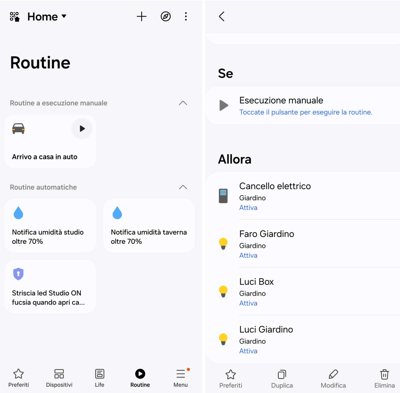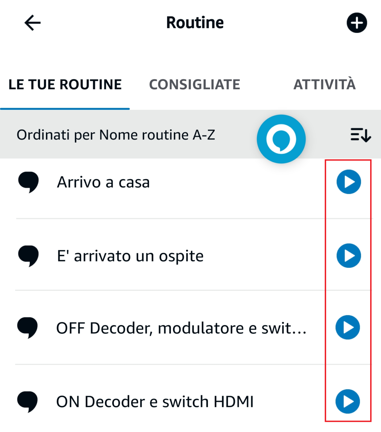 In entrambi i modi. Se la routine prevede come trigger un comando specifico si può attivare manualmente premendo il tasto associato al comando (virtuale su touch smartphone, Smart Button, telecomando, ecc.) o pronunciando il comando vocale (vedi sotto).