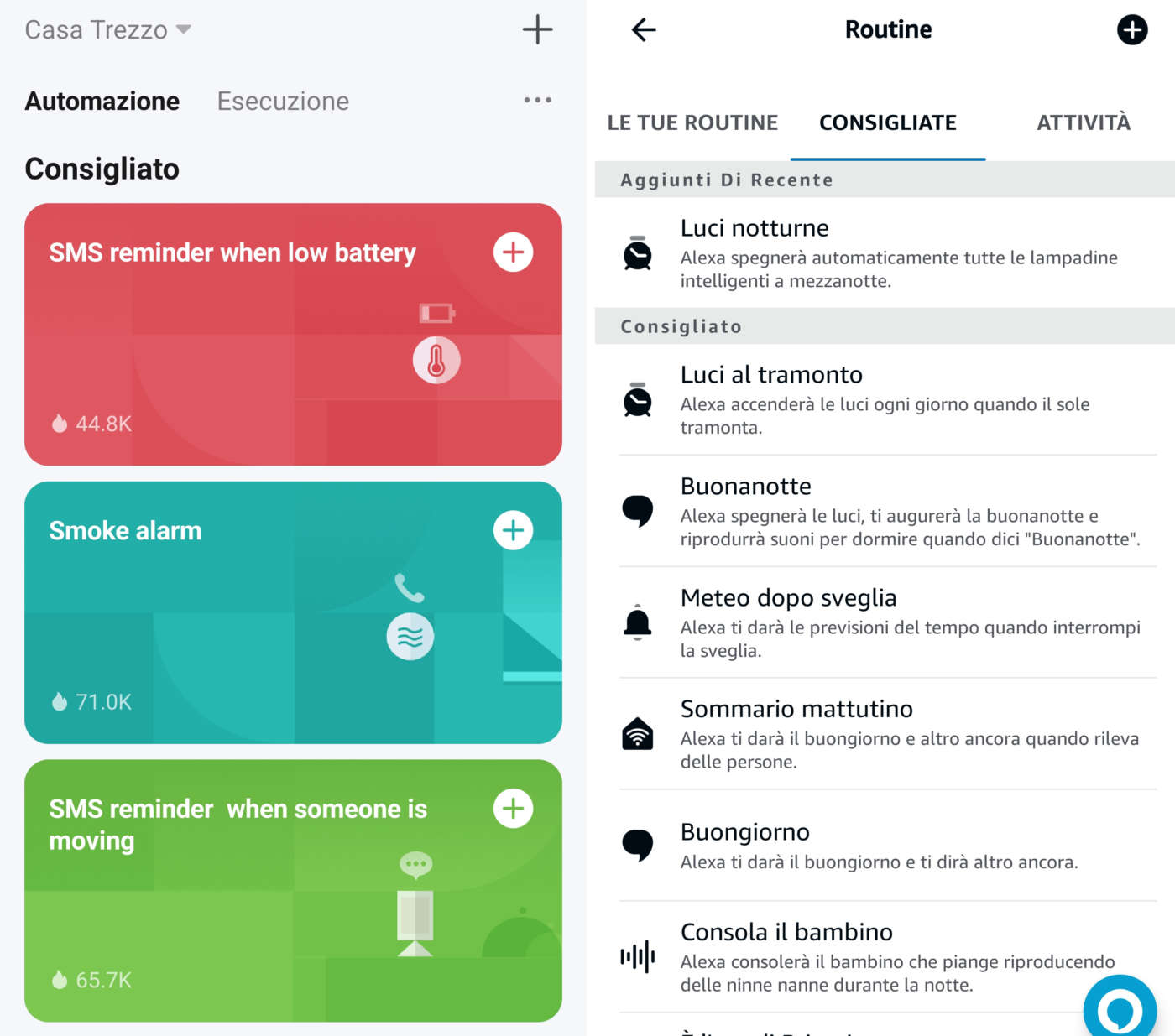 Cliccare su + per aggiungerne una nuova automazione, scegliere l’evento trigger (Se questo avviene – comando vocale, on/off smart switch o sensore, ecc.) e le azioni da attivare (Poi esegui – on/off dispositivi, notifica, ecc.). Al termine si salva l’automazione appena creata, le si dà un nome (opzionale) e si prova.