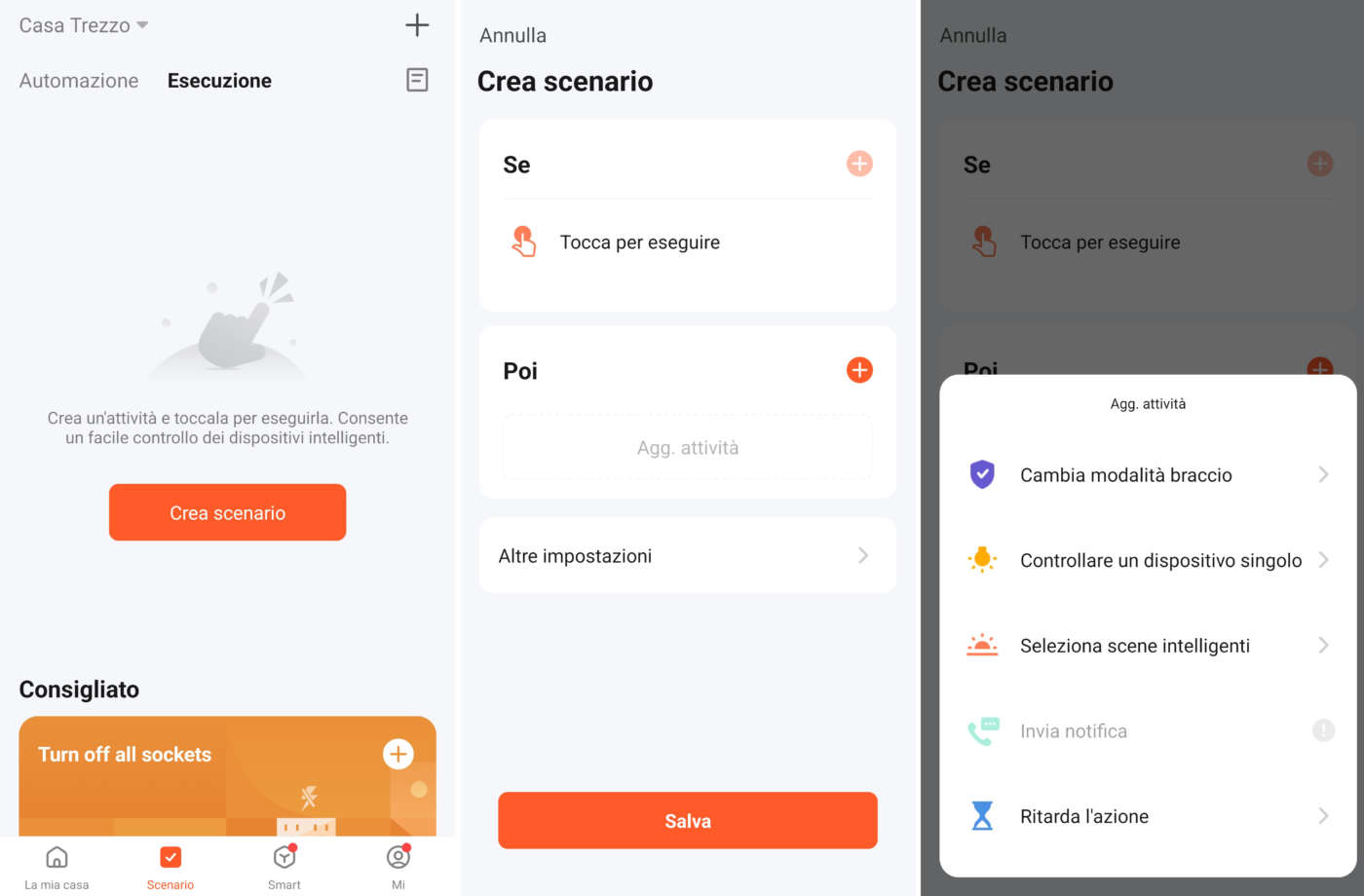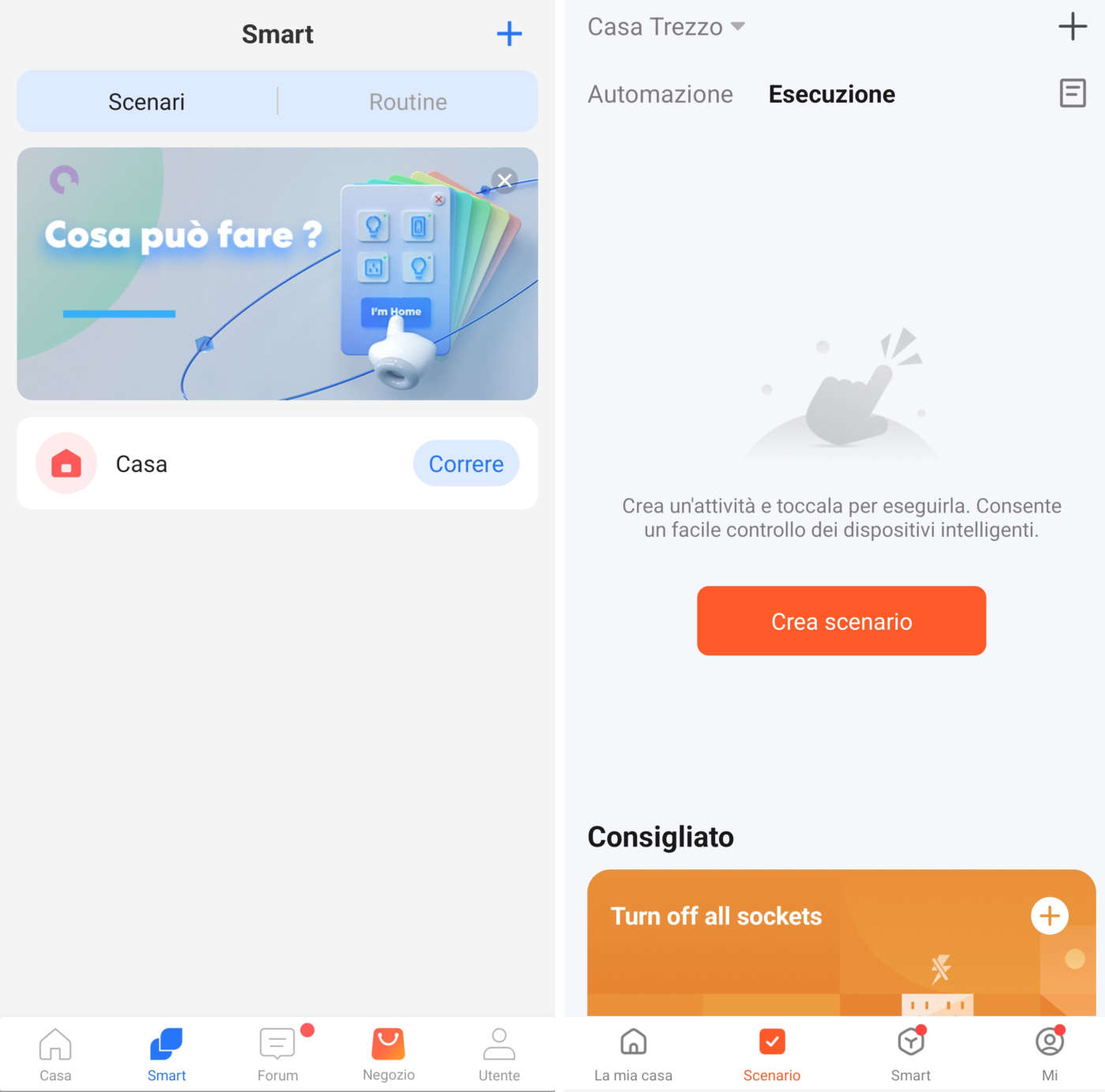 È molto semplice, veloce e alla portata di tutti. Basta aprire la app dedicata ai dispositivi smart da comandare manualmente o automaticamente, cliccare su Scena, Scenario, Smart o altra voce simile e scegliere tra Scenari, Routine, Esecuzione, Automazione manuale o automatica (se disponibili).