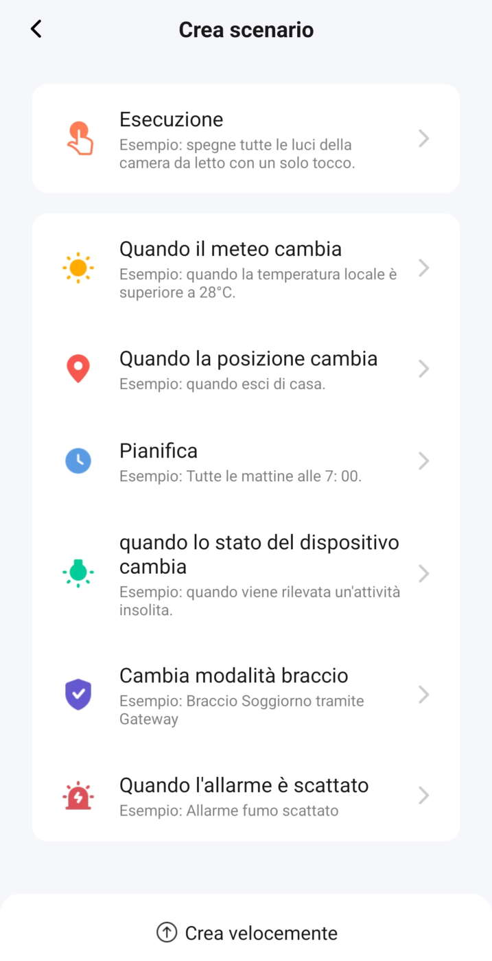 L’unica differenza è che l’evento “scatenante”, chiamato in gergo “trigger”, non è sempre un comando manuale ma può essere l’attivazione o la disattivazione di un altro dispositivo smart presente in casa (switch, luci, prese, citofono, ecc.), la rilevazione di un sensore (porta-finestra, movimento, fumo, allagamento, ecc.) oppure una condizione ambientale (es: temperatura esterna superiore o inferiore ad una certa soglia, orari di alba e tramonto, ecc.).