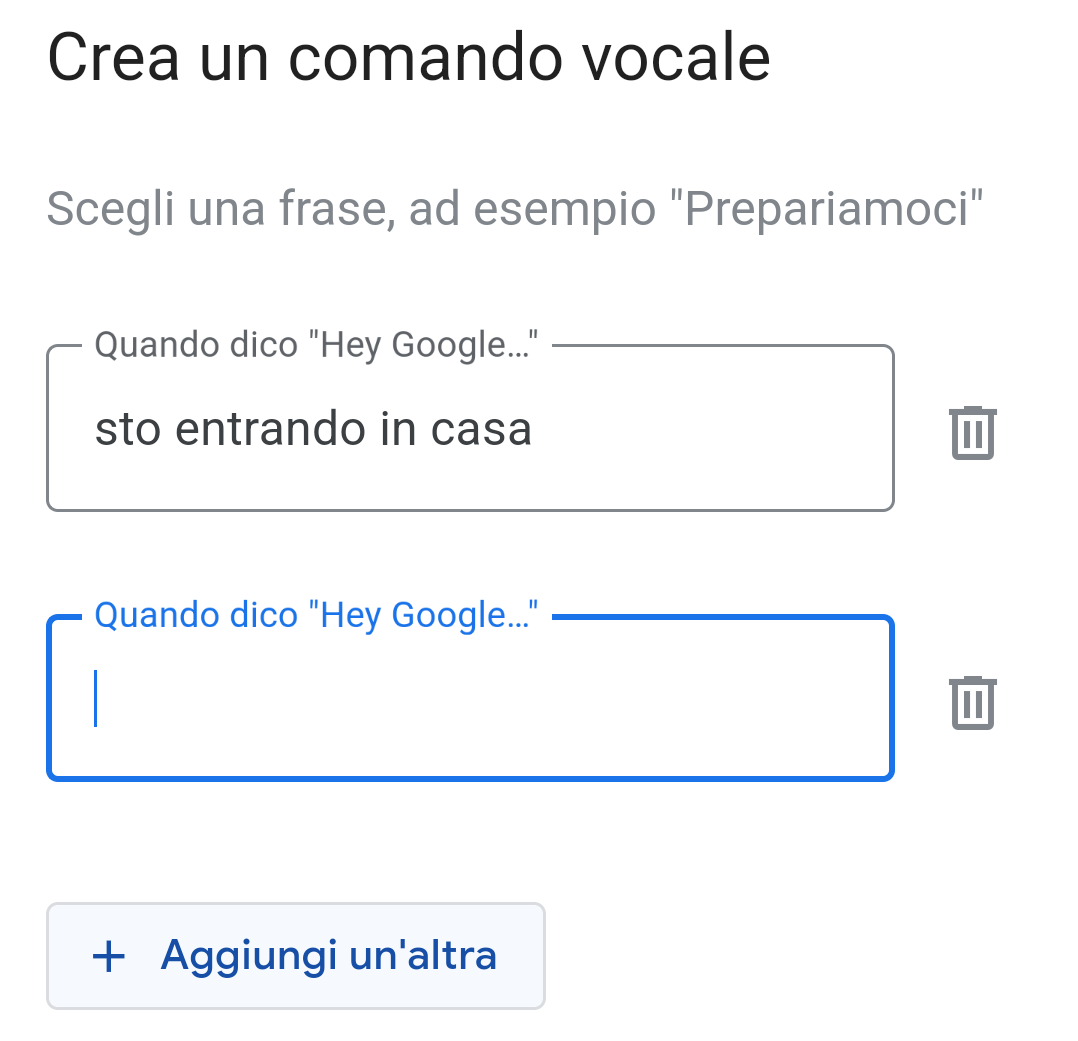È possibile scegliere più frasi per avviare la stessa routine e impostare un comando iniziale “non vocale” come visto sopra (ora di inizio/fine, alba o tramonto, ecc.).