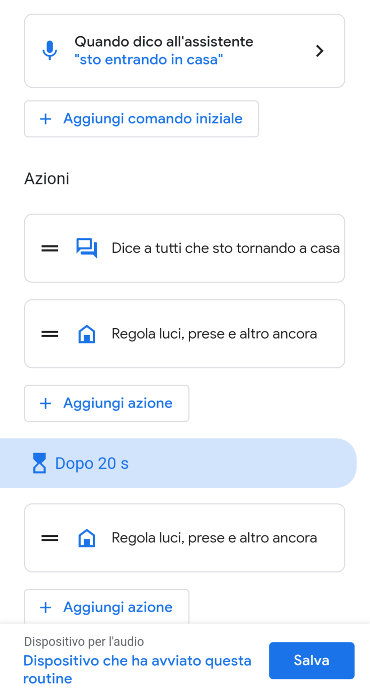 Dopo aver cliccato su “Fine” o sul segno di spunta in alto a destra, tornerete alla schermata principale e potrete aggiungere altre azioni come, ad esempio, annunciare il proprio arrivo a casa tramite gli smart speaker Nest o Google Mini, inviare un SMS personalizzato o far pronunciare all’assistente Google una frase qualsiasi (es.: Benvenuto a casa), attivare o disattivare la modalità “non disturbare” sullo smartphone, riprodurre della musica, una radio o le ultime notizie, annunciare gli impegni della giornata o i promemoria per la casa, ecc. Ogni singola azione può essere riordinata trascinandola sopra o sotto così da ottenere la sequenza preferita.