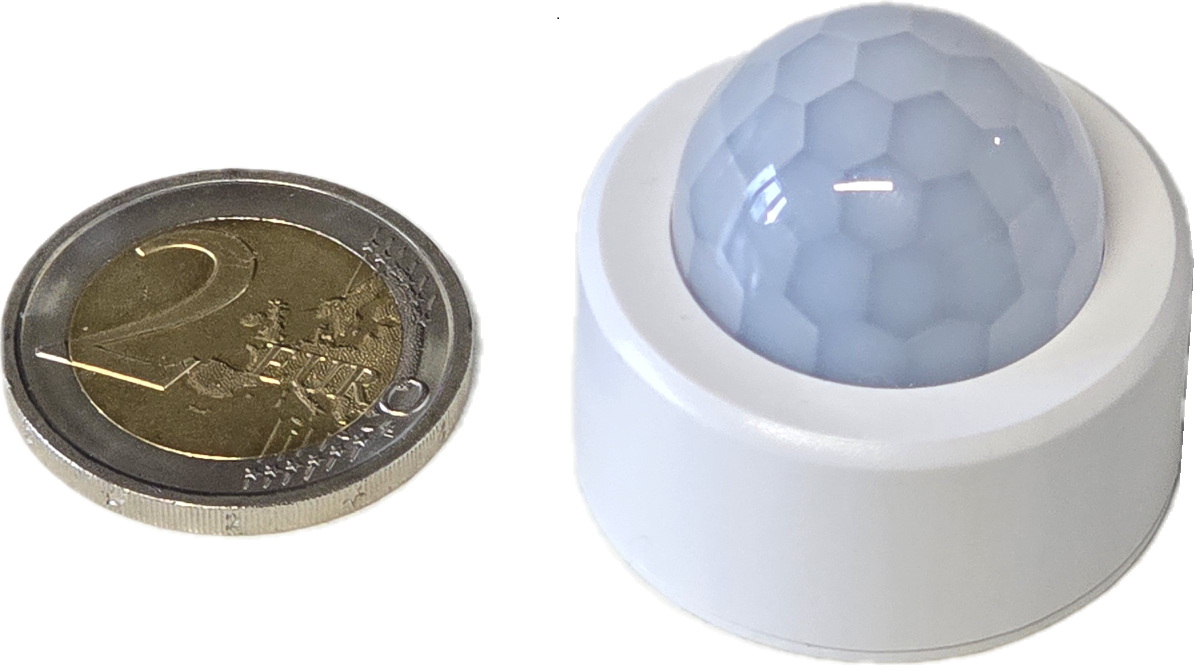 Sensore di movimento compatto e leggero (40x35x28 mm, 21 grammi) installabile a parete o soffitto per monitorare i movimenti in stanze, corridoi, garage, ecc.
