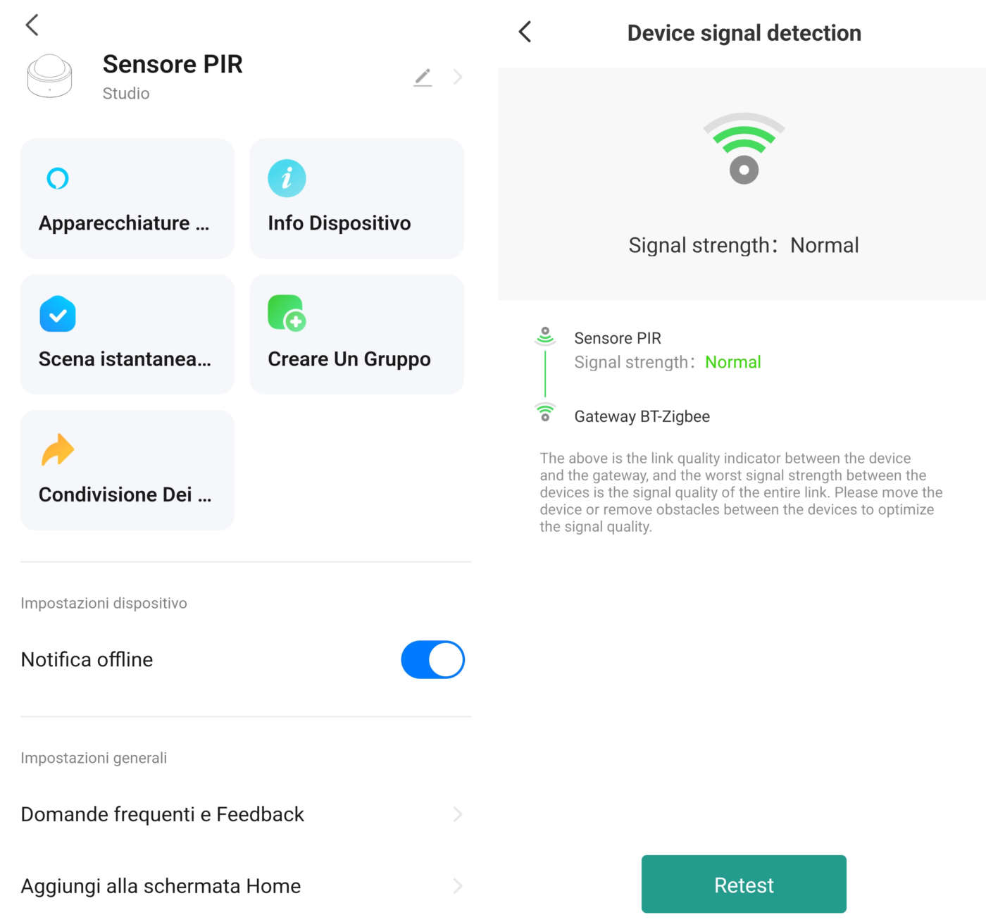 Nelle schermate home o di setup si trovano anche lo stato di carica della batteria (con avviso quando il livello è troppo basso), la cronologia delle attivazioni (data e ora in cui è stato rilevato un movimento), la possibilità di creare routine e scenari, gruppi o condivisioni, testare la qualità della connessione, visualizzare le info del dispositivo (codice ID, indirizzo MAC, ecc.).