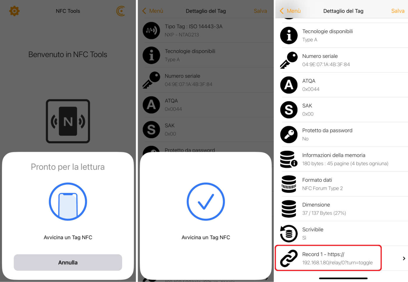 Dopo aver configurato il dispositivo Shelly per i comandi NFC è necessario programmare lo smart tag con lo smartphone e la app NFC Tools (o altra) seguendo queste semplici istruzioni: