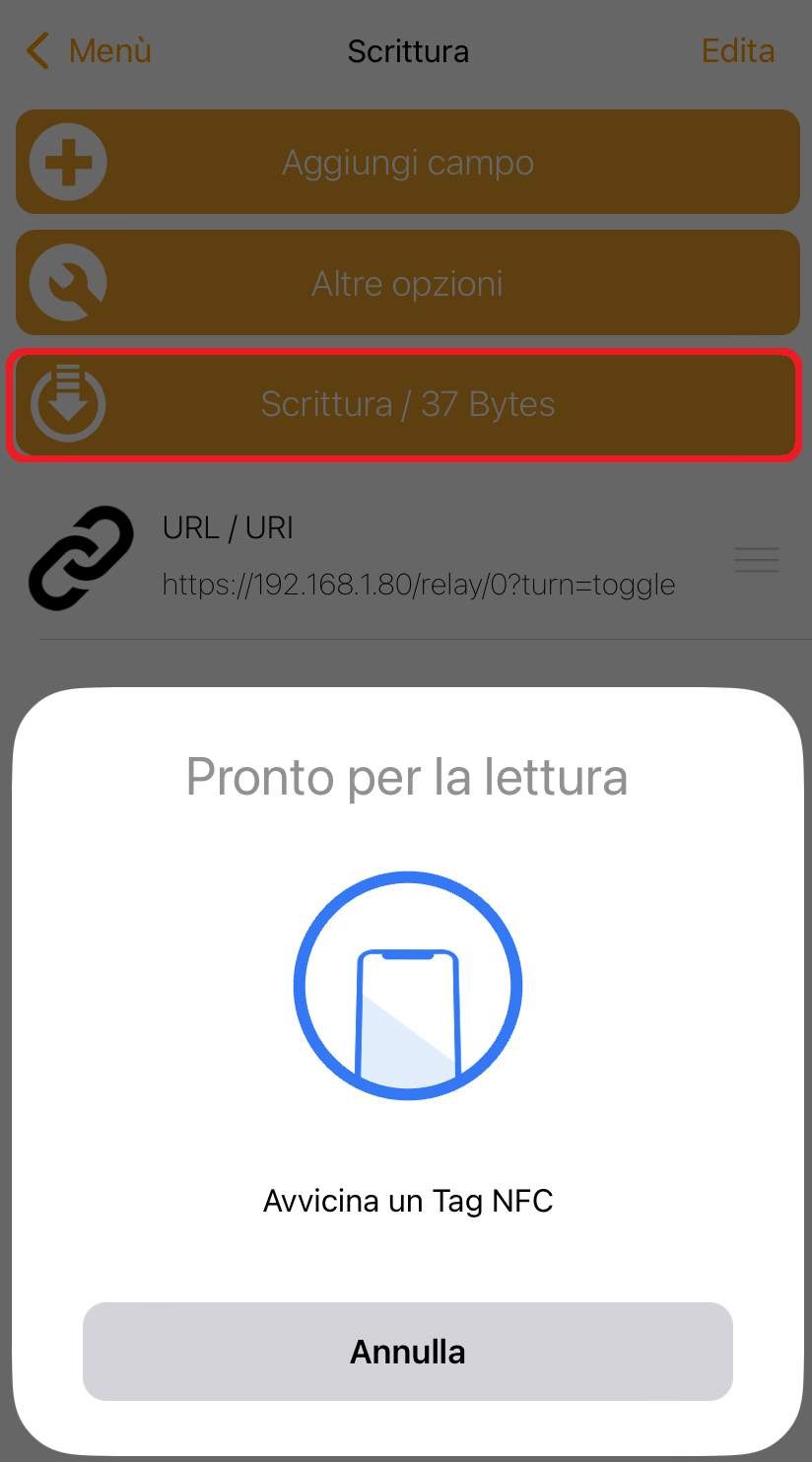 - Cliccate su Scrittura/xx Bytes e avvicinate lo smart tag allo smartphone per la scrittura dei dati;