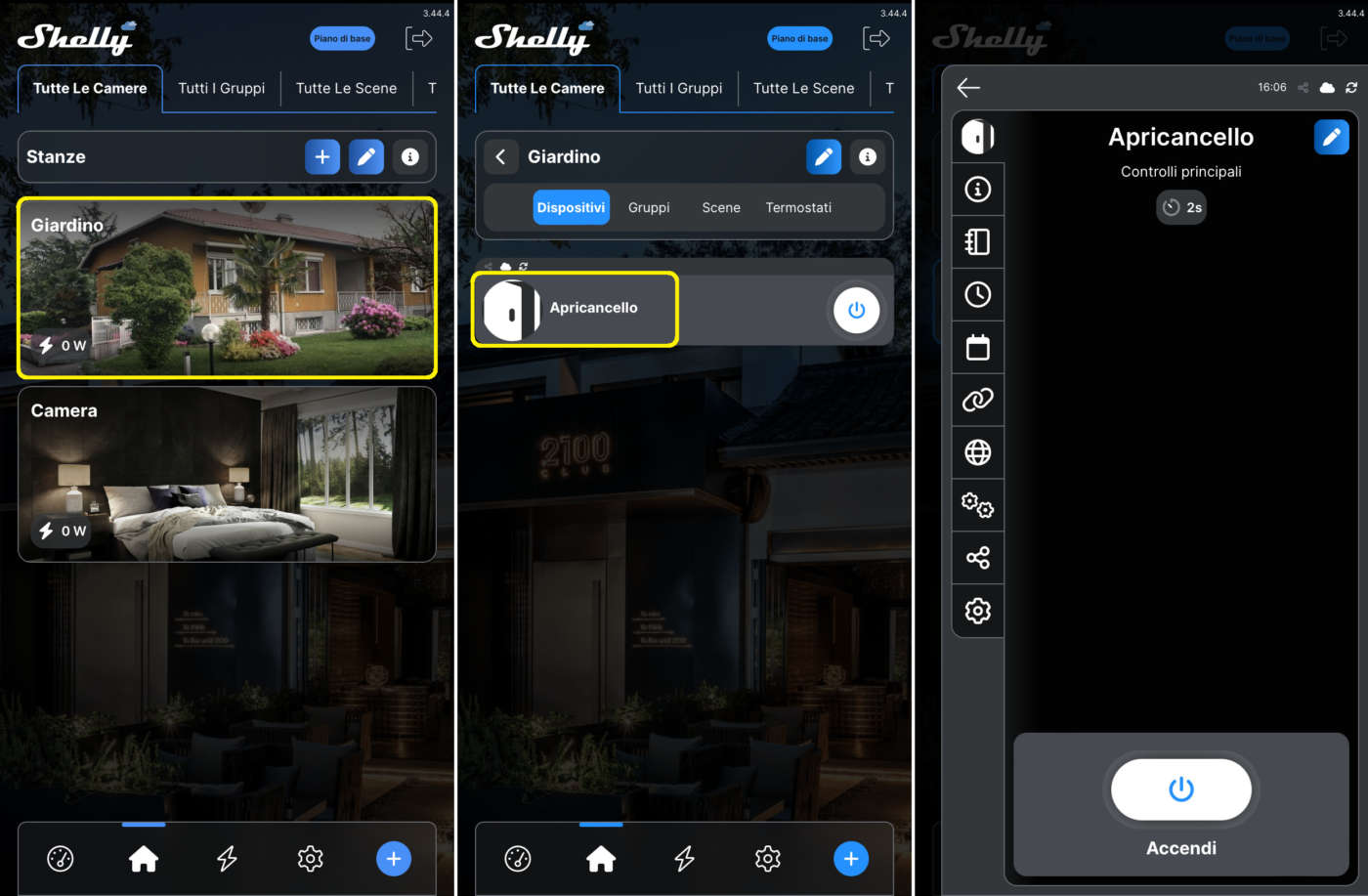 - Cliccate sulla stanza dove si trova lo smart switch/plug da comandare (es.: giardino) e poi sul dispositivo (es.: apricancello) per aprire il menu impostazioni/personalizzazioni;