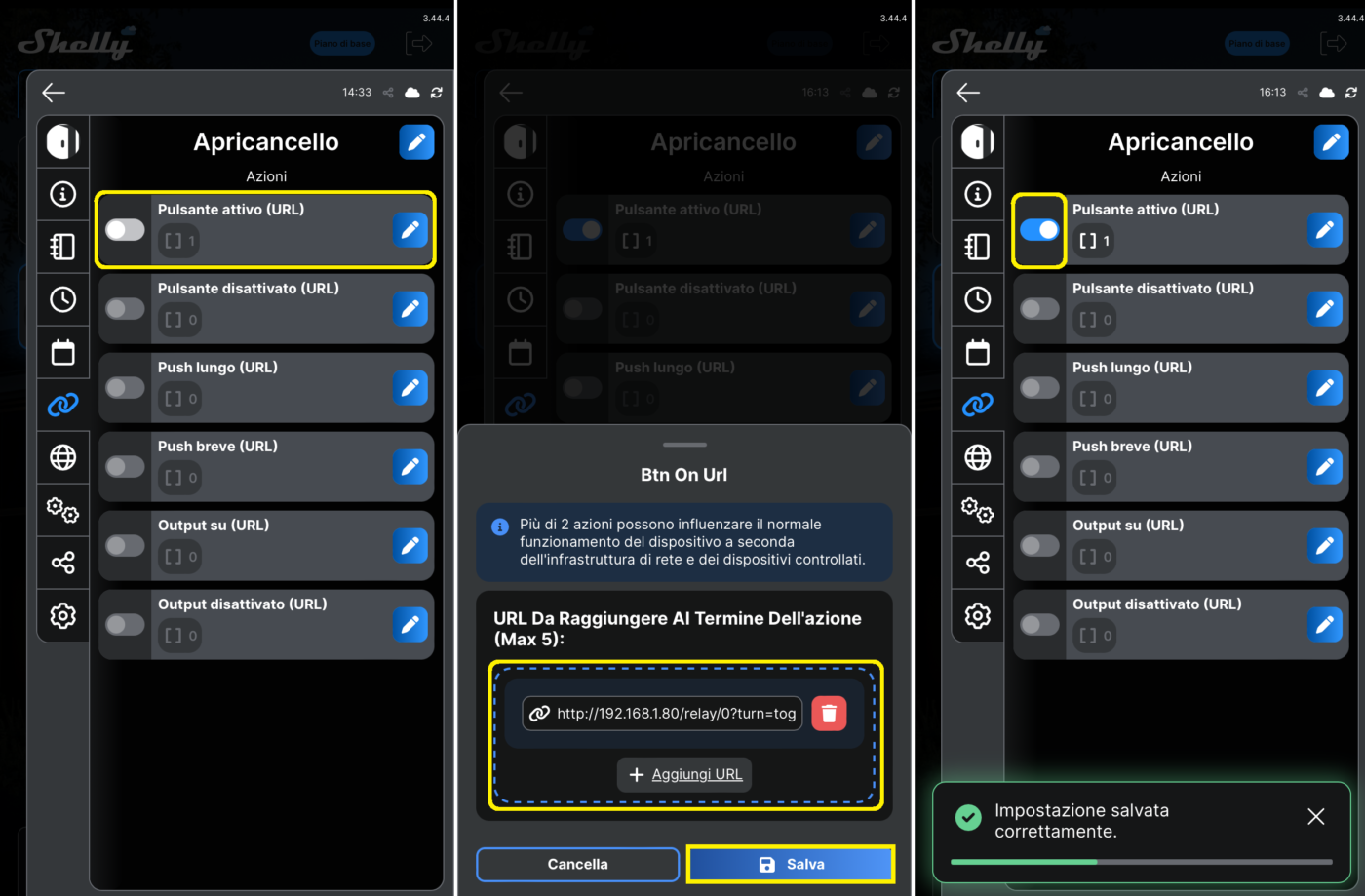 - Cliccate sull’icona Anelli a sinistra (Azioni), cliccate sulla prima azione in alto (Pulsante attivo – URL) e digitate nel campo in basso la seguente stringa: https://xxx.yyy.zzz.kkk/relay/0?turn=toggle. Al posto di yyy.zzz.kkk inserite l’indirizzo IP del dispositivo Shelly visto sopra (es.: 192.168.1.80) e al termine cliccate su Salva. Nella schermata precedente (Azioni) attivate la prima azione che avete appena configurato (lo slide diventa azzurro);