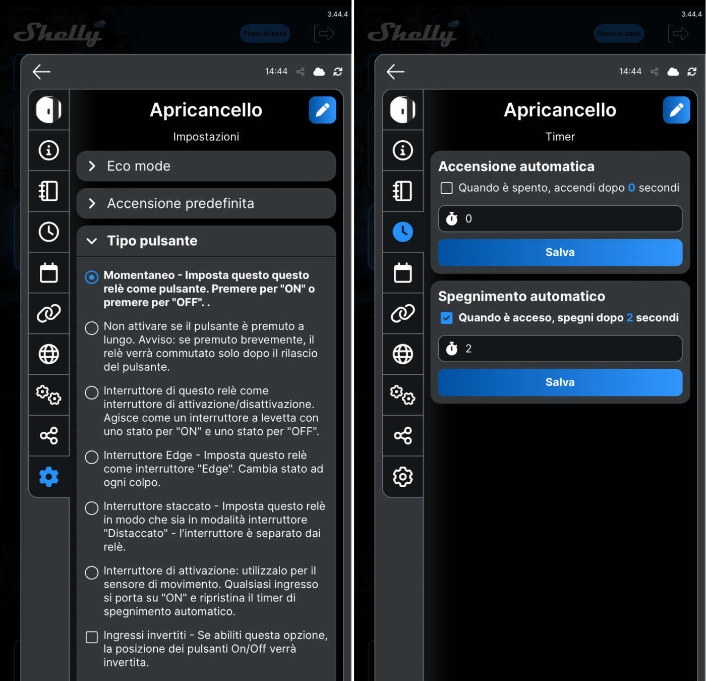 - Se lo switch viene utilizzato come pulsante momentaneo (es.: apricancello) controllate le voci del menu impostazioni (tipo pulsante: momentaneo) e del menu timer (spegnimento automatico dopo 2-3 secondi). Per altre applicazioni (es.: accensione o spegnimento luci, elettrodomestici, ecc.) configurate il dispositivo Shelly come spiegato qui o chiedete aiuto sul forum Shelly Italia.