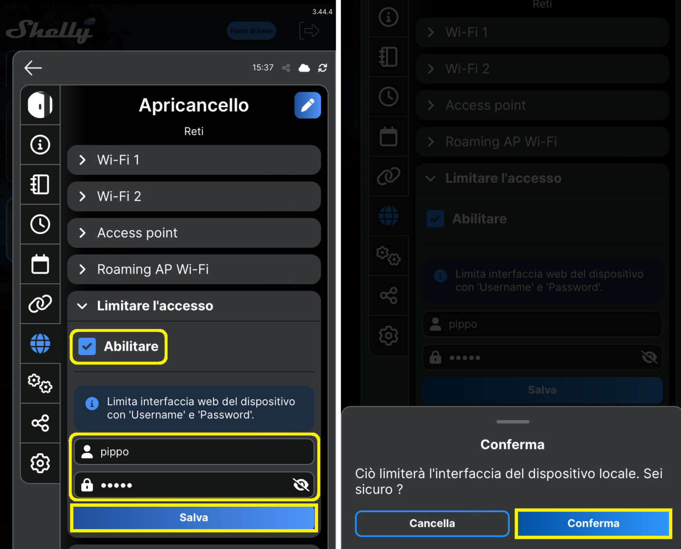 - Spuntate la voce Abilitare e digitate sia un nome utente (es.: pippo) sia una password a scelta. Al termine cliccate su Salva e poi su Conferma;