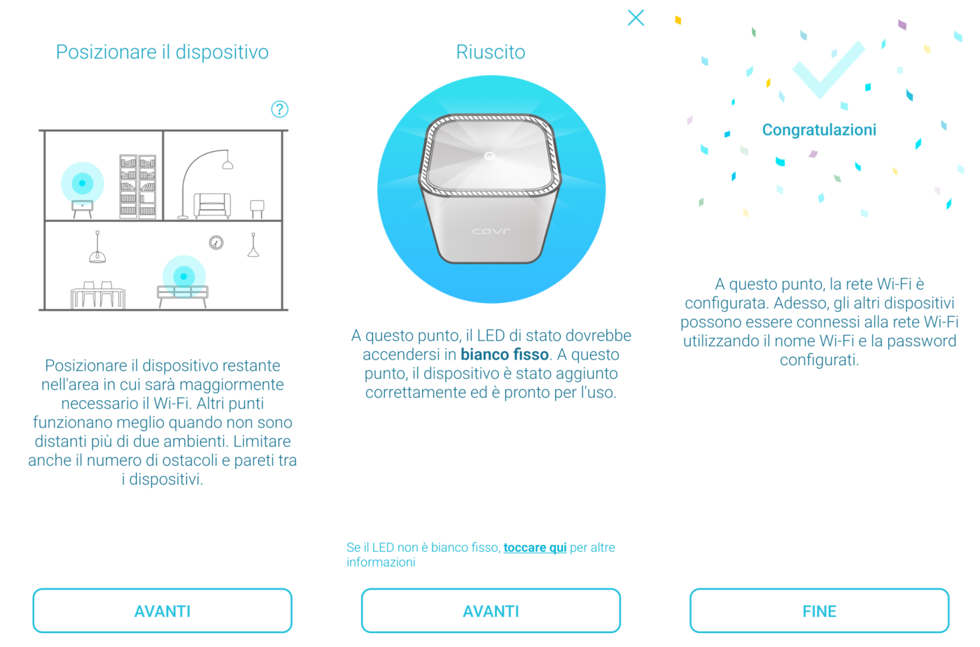 Al termine della procedura di configurazione scollegare le unità slave (satelliti), posizionarle nelle varie stanze di casa non troppo lontano né vicino tra loro e l’unità master, ricollegarle e verificare la copertura del Wi-Fi con lo smartphone.
