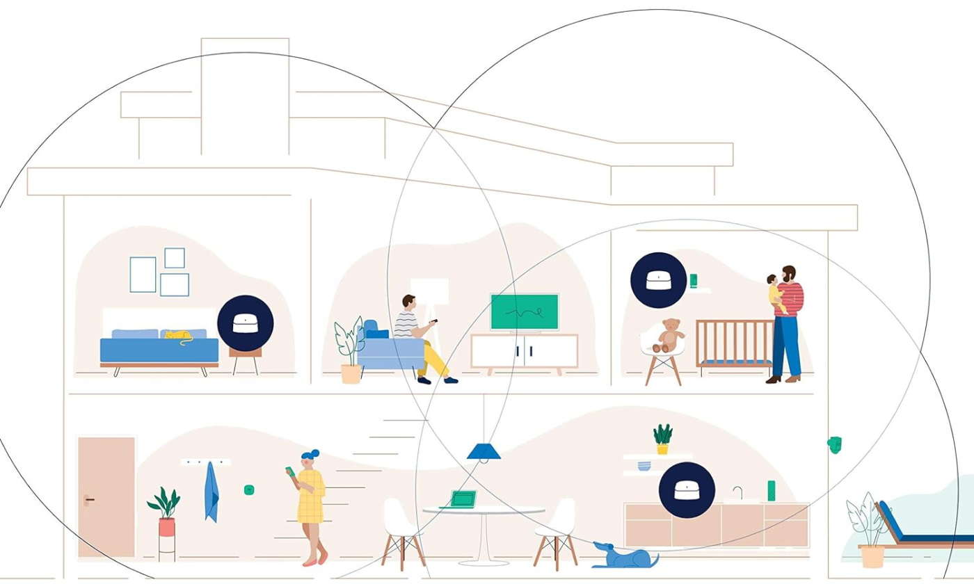 Un sistema Wi-Fi Mesh è composto da vari moduli chiamati “router” e “satelliti” di forma compatta ed elegante (cubi, torrette, ecc.) che dialogano tra loro e con il modem-router principale.