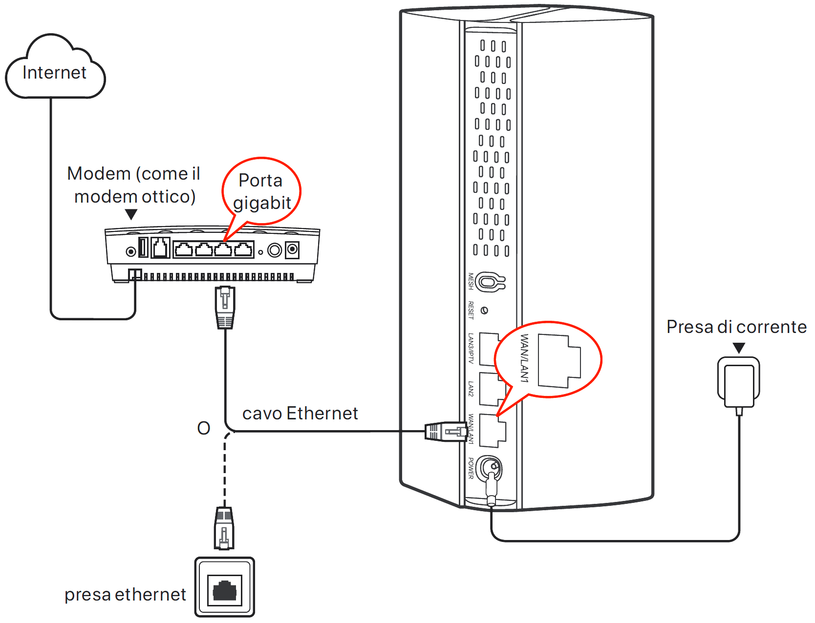 Come già anticipato, l’unità Mesh Master (oppure uno dei satelliti) richiede quasi sempre un collegamento fisico al punto di accesso internet o Ethernet come la presa telefonica con doppino, quella in fibra ottica o la porta LAN del modem o modem-router originale.