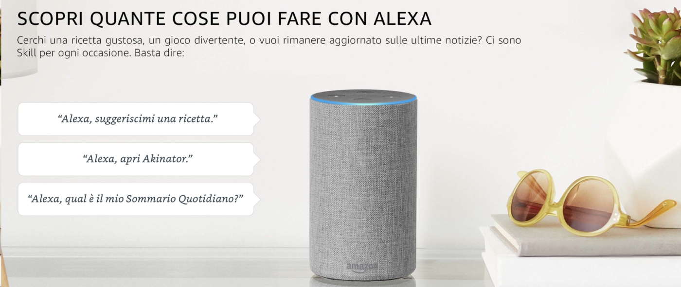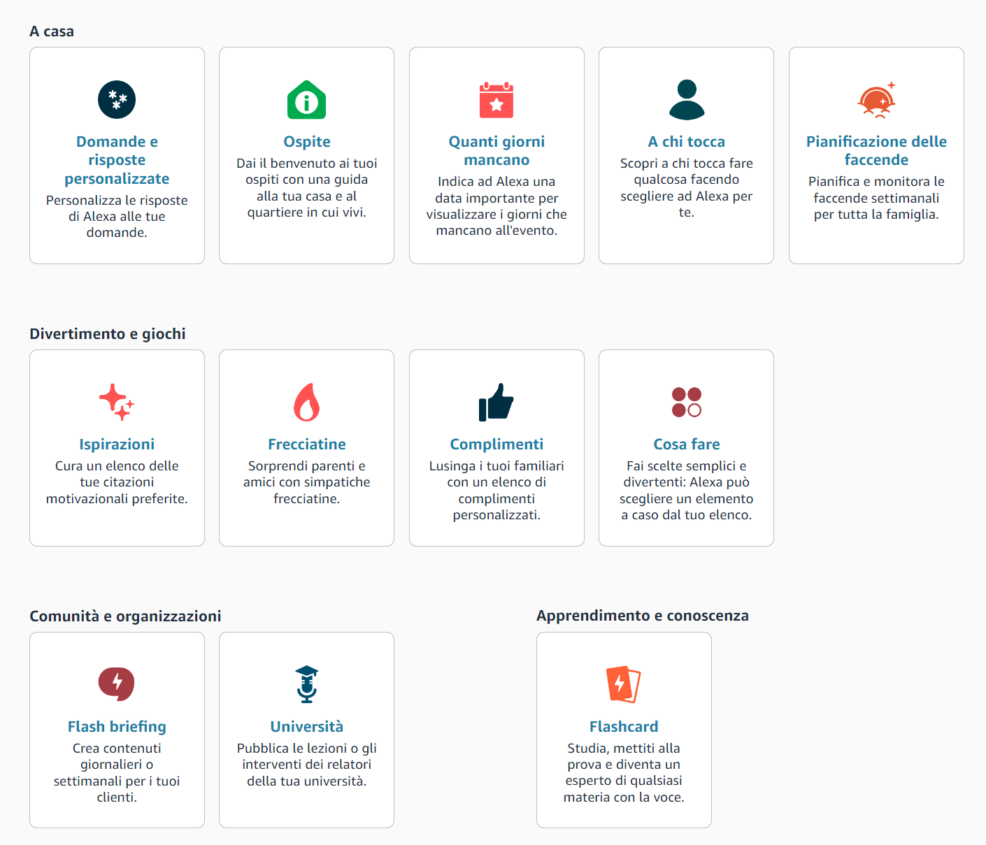 L’ecosistema smart di Amazon che comprende gli smart speaker e display Echo (es.: Echo Dot, Echo Show 5/8/10/15, ecc.), gli auricolari Echo Buds e altri dispositivi con Alexa integrato (Fire TV Stick, soundbar, Smart TV, ecc.) utilizza speciali applicazioni chiamate skill per accedere ai servizi disponibili (radio in streaming, podcast, notiziari, informazioni utili, ecc.), giocare e controllare i dispositivi domotici.