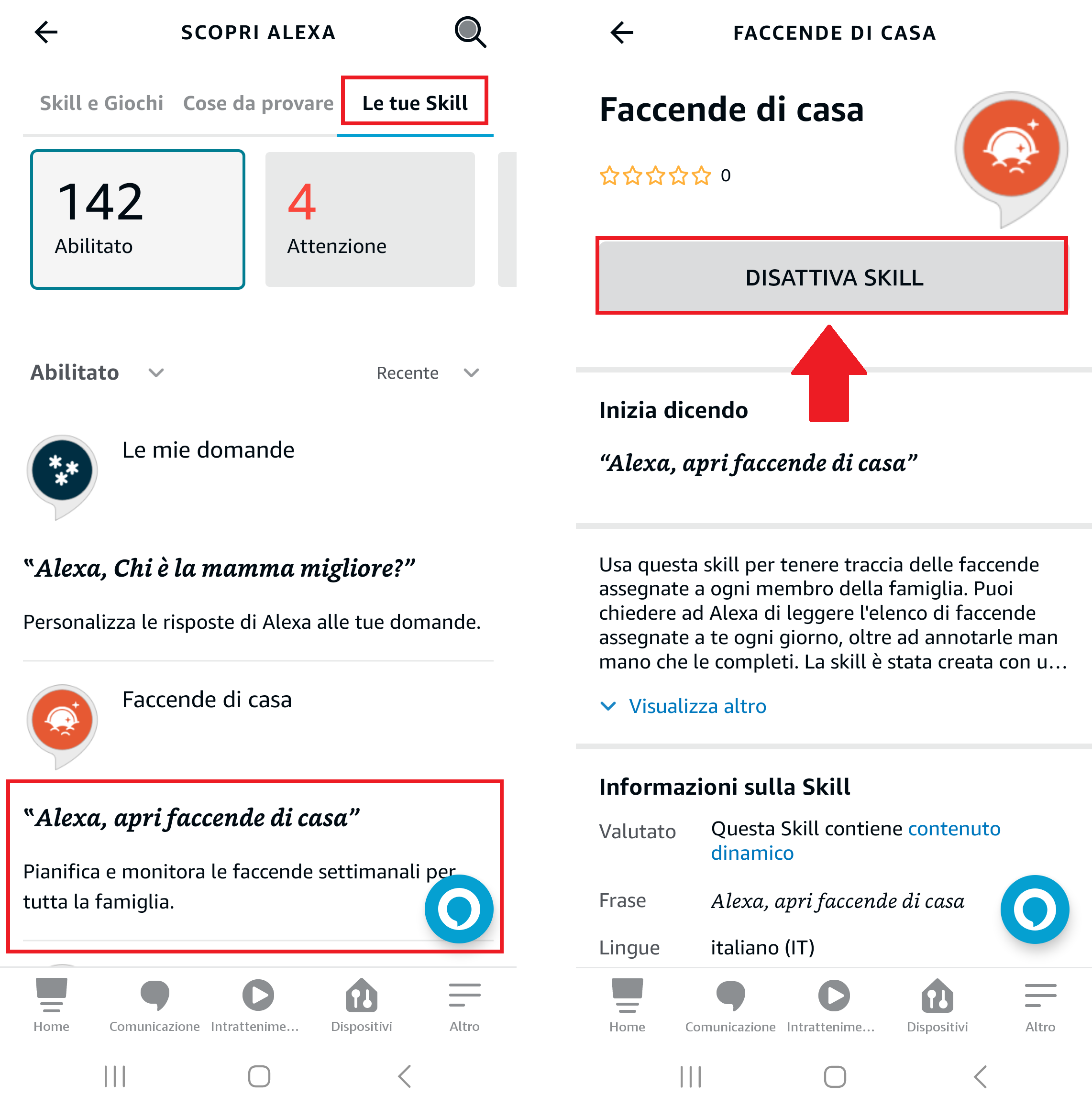 Potete decidere in qualsiasi momento di disabilitare una delle skill che avete creato e personalizzato senza però eliminarla dal vostro account Amazon. Basta accedere alla app Alexa, selezionare “Skill”, poi “Scegli le tue skill”, selezionare quella desiderata e cliccare su “Disabilita skill”.