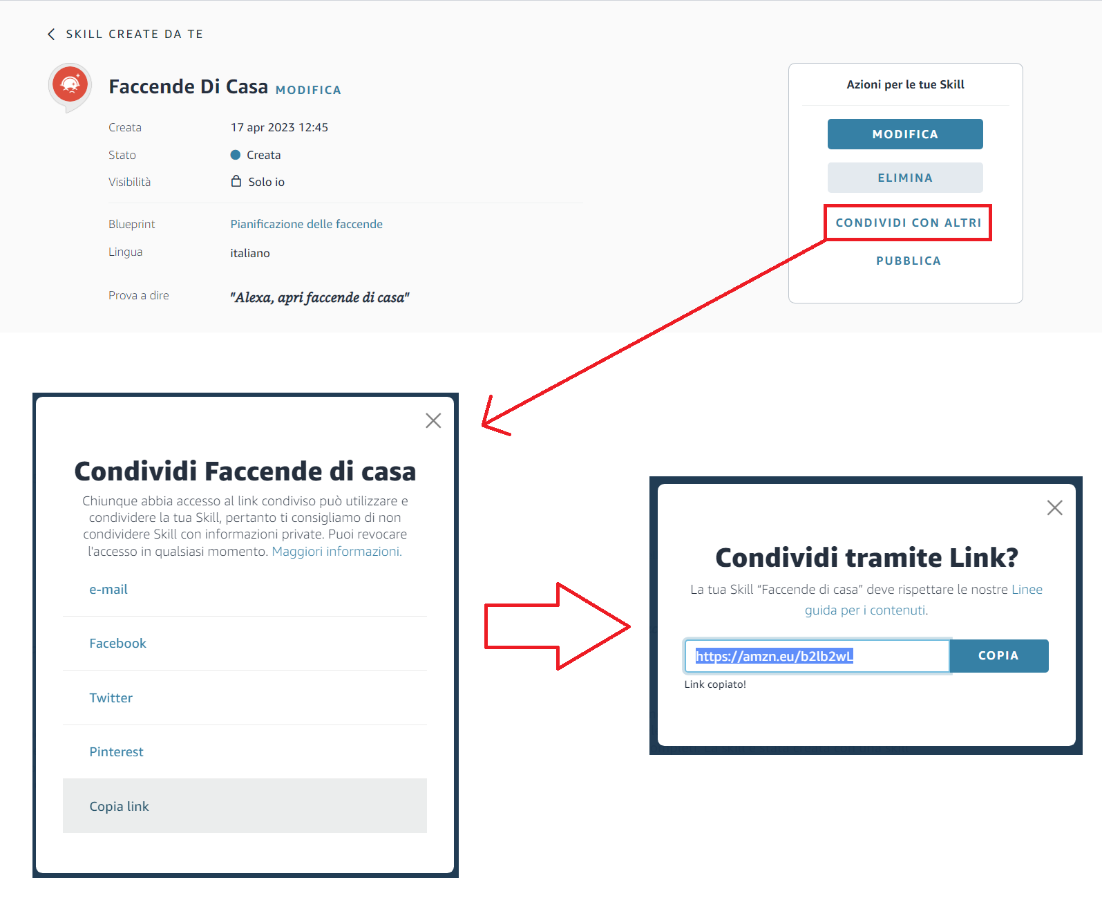 Per condividere una skill personalizzata con Blueprint basta accedere alla home page di Blueprint Alexa, cliccare in alto su “Skill che hai creato”, selezionare la skill da condividere (con visibilità “Solo io”), poi “Dettagli” e infine su “Condividi con altri”.