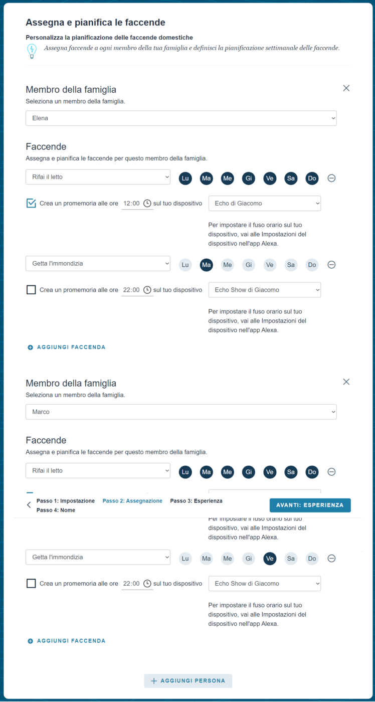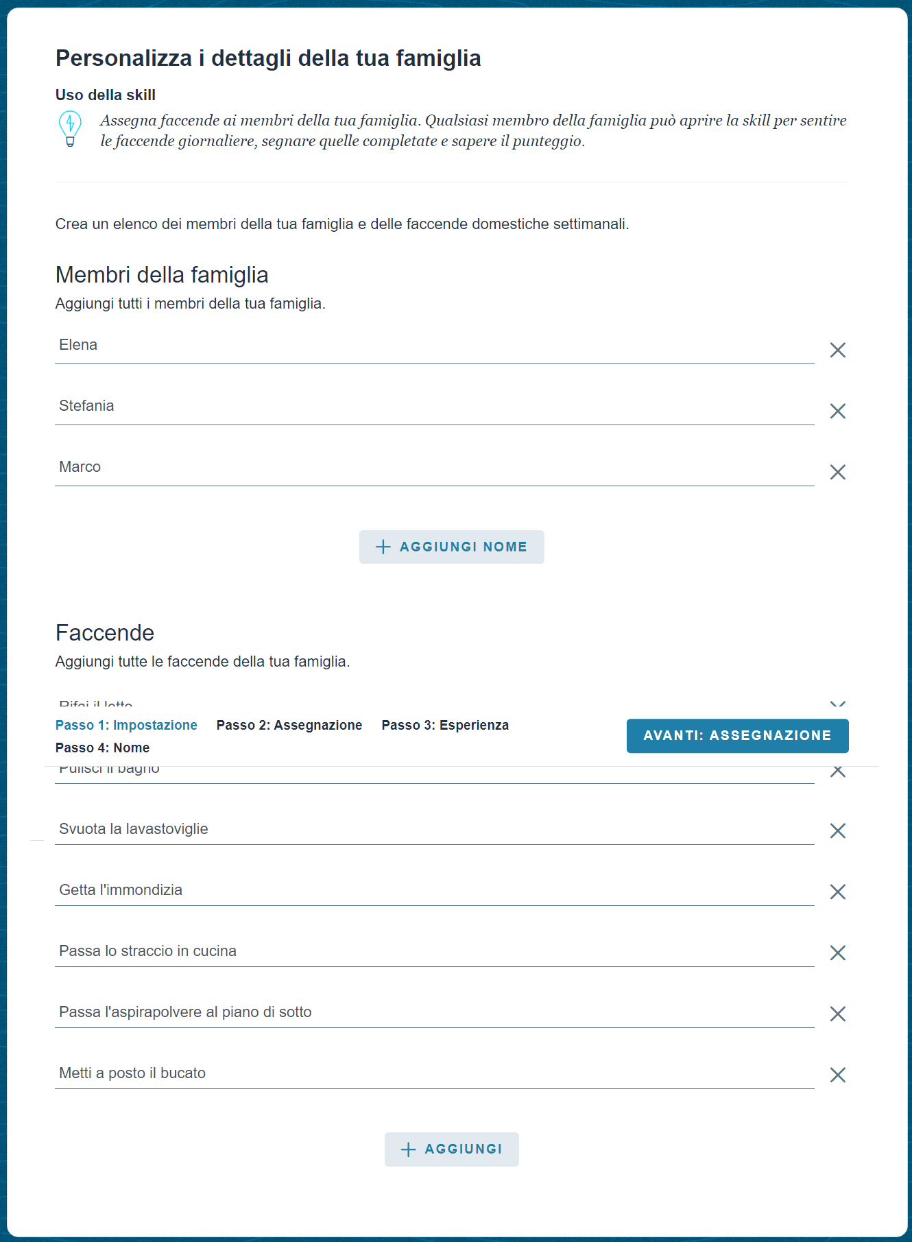 Immaginiamo di creare una skill per organizzare le faccende domestiche ed assegnarle ai componenti della famiglia. Dopo avere scelto il modello “Pianificazione delle faccende domestiche” digitate i nomi e i compiti utilizzando quelli preimpostati o aggiungendone di nuovi.