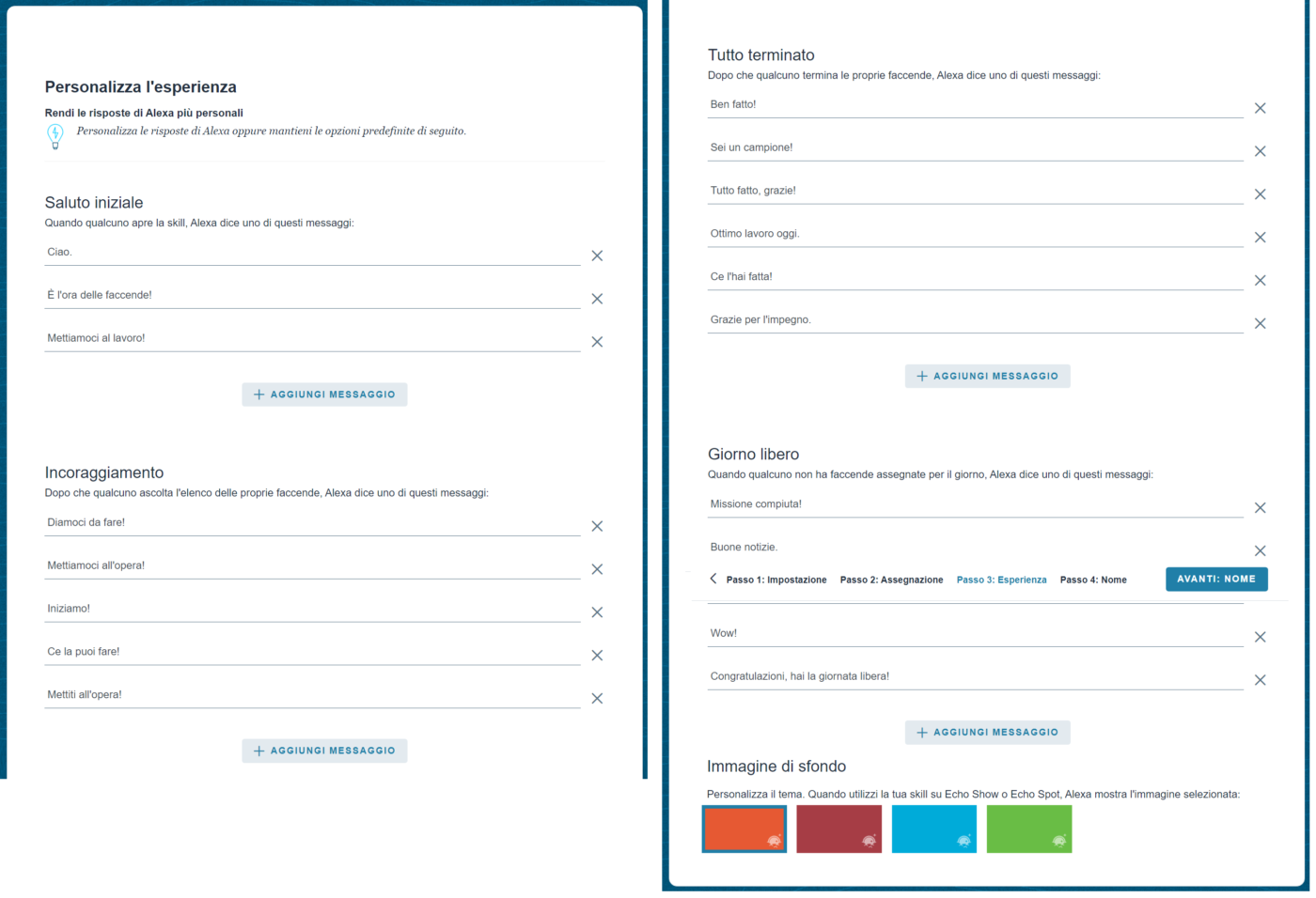 Utilizzate le risposte predefinite di Alexa oppure personalizzatele con le vostre frasi quando qualcuno apre la skill (saluto iniziale), dopo aver ascoltato l’elenco delle proprie faccende (incoraggiamento), al termine o in un giorno libero. Potete anche personalizzare l’immagine di sfondo sui dispositivi Echo Show o Echo Spot.
