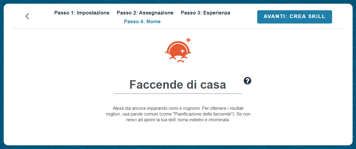 A questo punto dovete solo assegnare un nome alla skill (es.: faccende di casa) e cliccare in alto su “Avanti: crea skill” per salvarla.