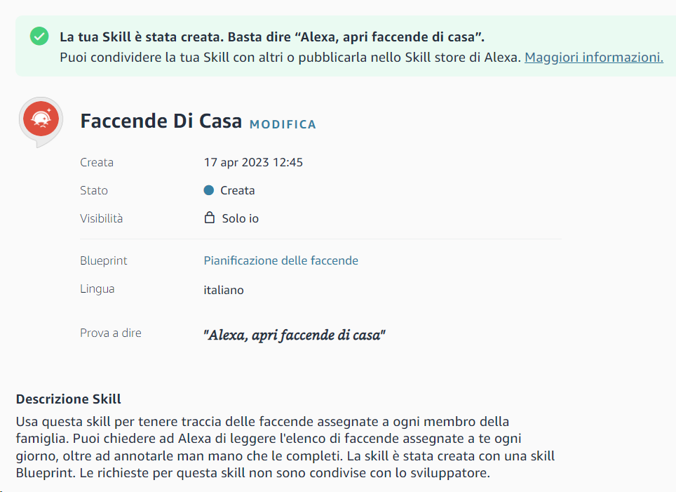 Dopo un paio di minuti la skill sarà pronta per essere utilizzata con il comando “Alexa, apri faccende di casa”.
