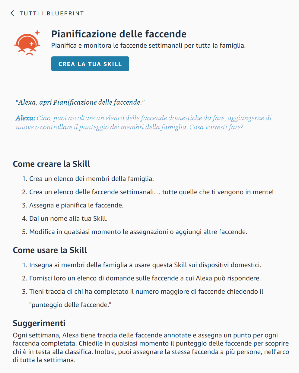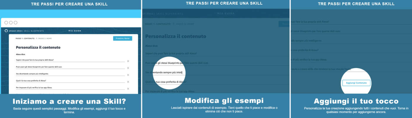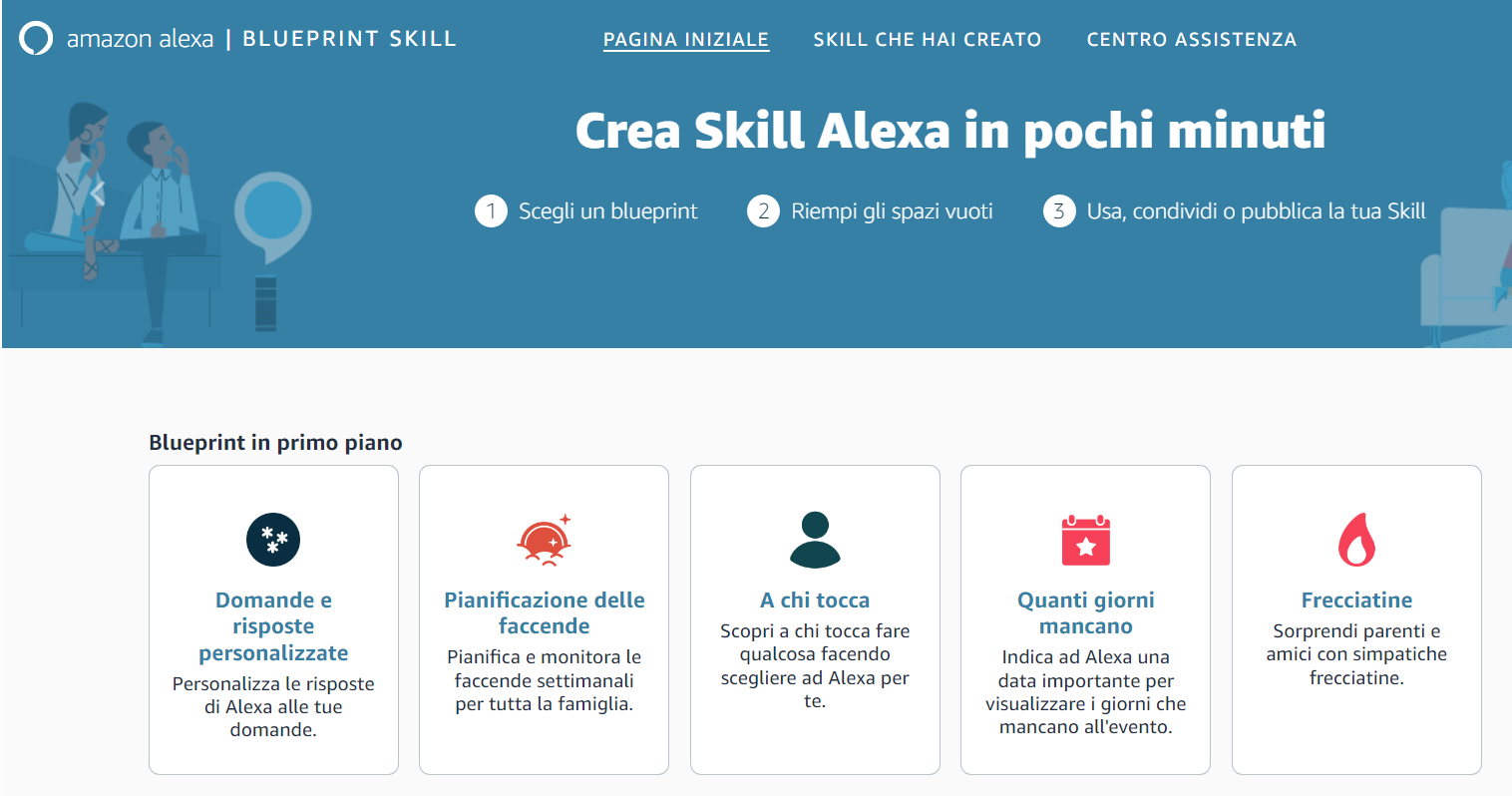 Il processo di creazione delle skill parte da questa pagina web oppure dalla app Alexa (menu/altro > Blueprint) scegliendo uno dei modelli preimpostati (template) da completare con domande, risposte ed altri contenuti personalizzati.